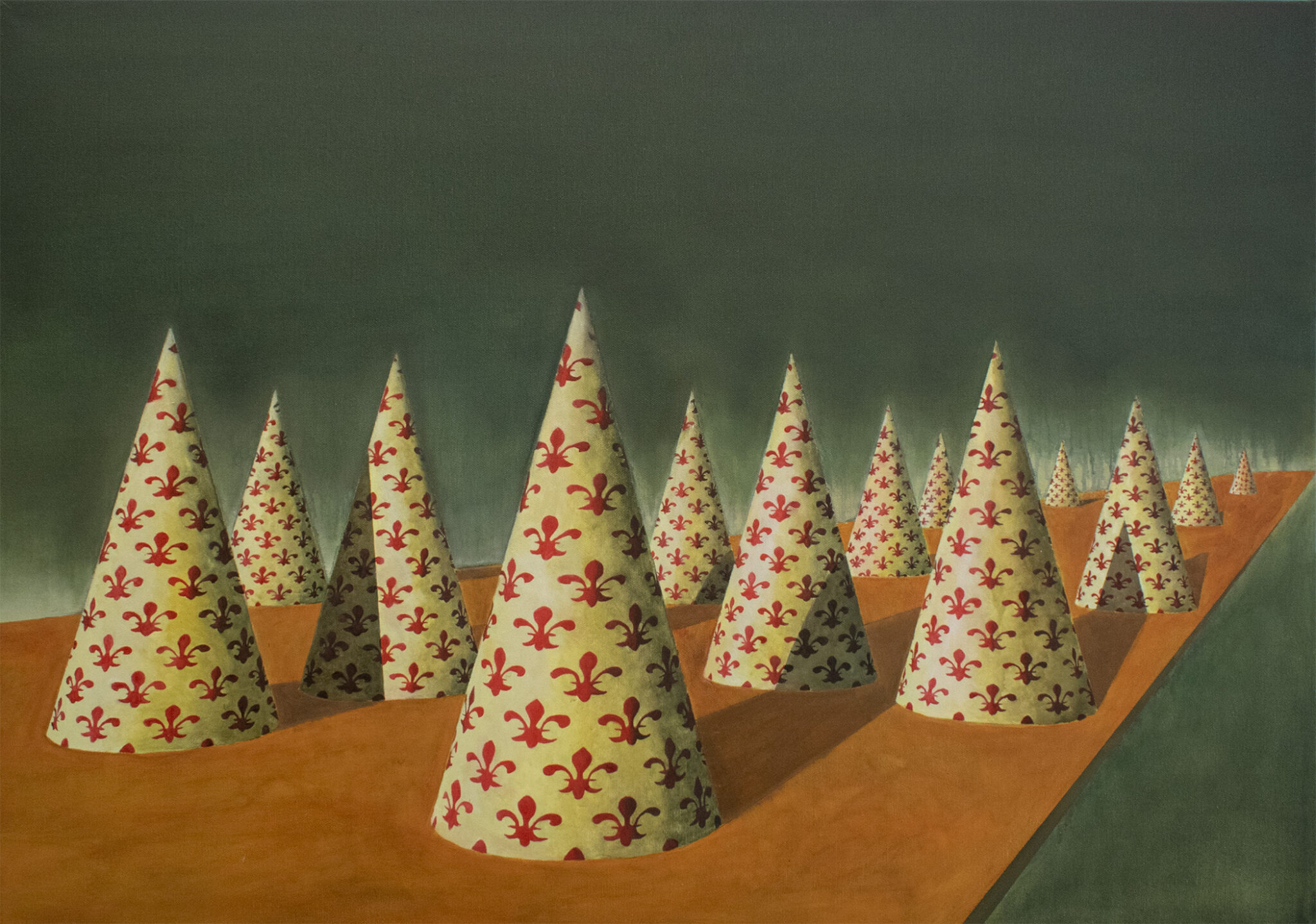 I miei dipinti cercano di rappresentare lo spazio intimo , interno, profondo, del bambino di cui il cono è sineddoche, che si muove nel mondo in situazioni sospese fra malinconia e mistero, fra ciò che non sa ma sente e ciò che sa e non riesce a sentire, fra ciò che si nasconde e ciò che è nascosto. Il bambino dentro all’uomo vive il suo “mondo intermedio “ attraverso una seconda pelle , rivestito di abiti eleganti, avvolto in fiabeschi travestimenti, consapevole e non delle possibilità della sua fantasia.