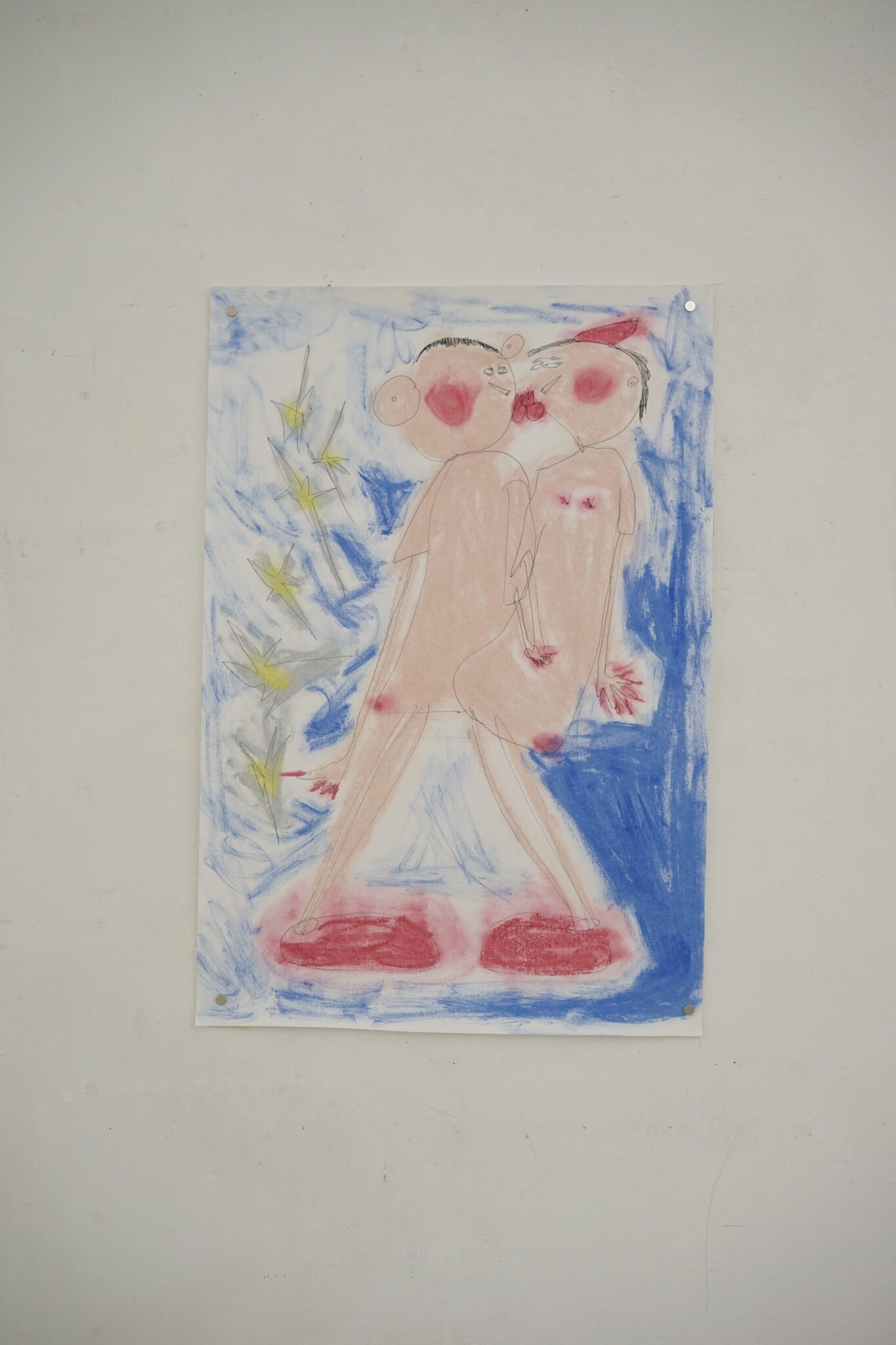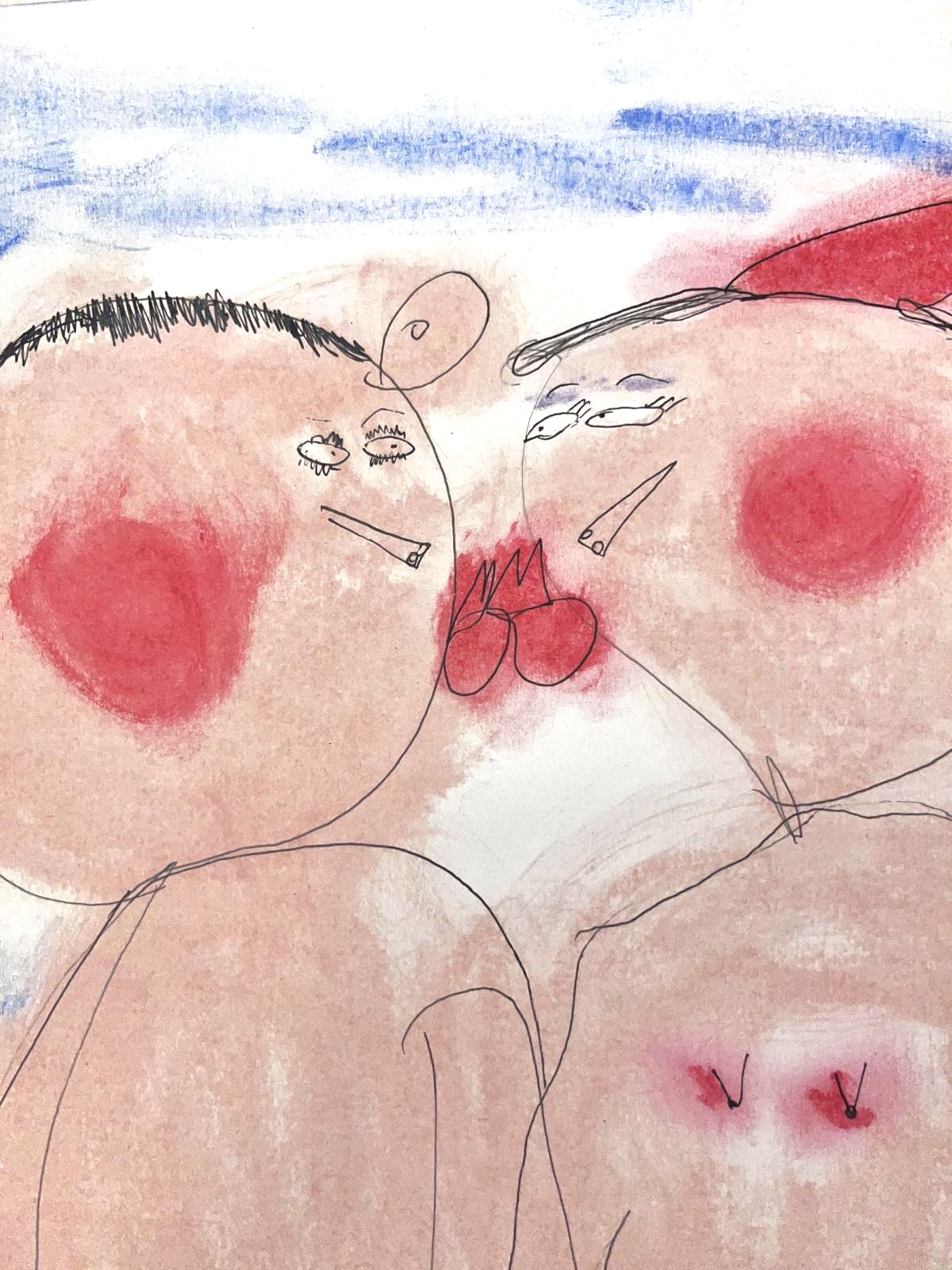 Quest'opera esprime un'intensità emotiva e una crudezza espressiva attraverso un linguaggio artistico quasi surreale. Due figure umane, stilizzate, si intrecciano in un bacio carico di tensione. I loro volti rotondi, segnati da guance arrossate, evocano un senso di fanciullezza ma anche di inquietudine. I corpi sono delineati con tratti sottili e incerti, mentre il colore rosato della pelle si fonde con lo sfondo caotico, composto da pennellate di blu. Gli elementi astratti e le forme appuntite sul lato sinistro suggeriscono un'energia perturbante, forse una metafora di emozioni contrastanti o di una realtà interiore frammentata. Nel complesso, l'opera trasmette un senso di passione primitiva e, al contempo, di instabilità emotiva, lasciando spazio a molteplici interpretazioni.
