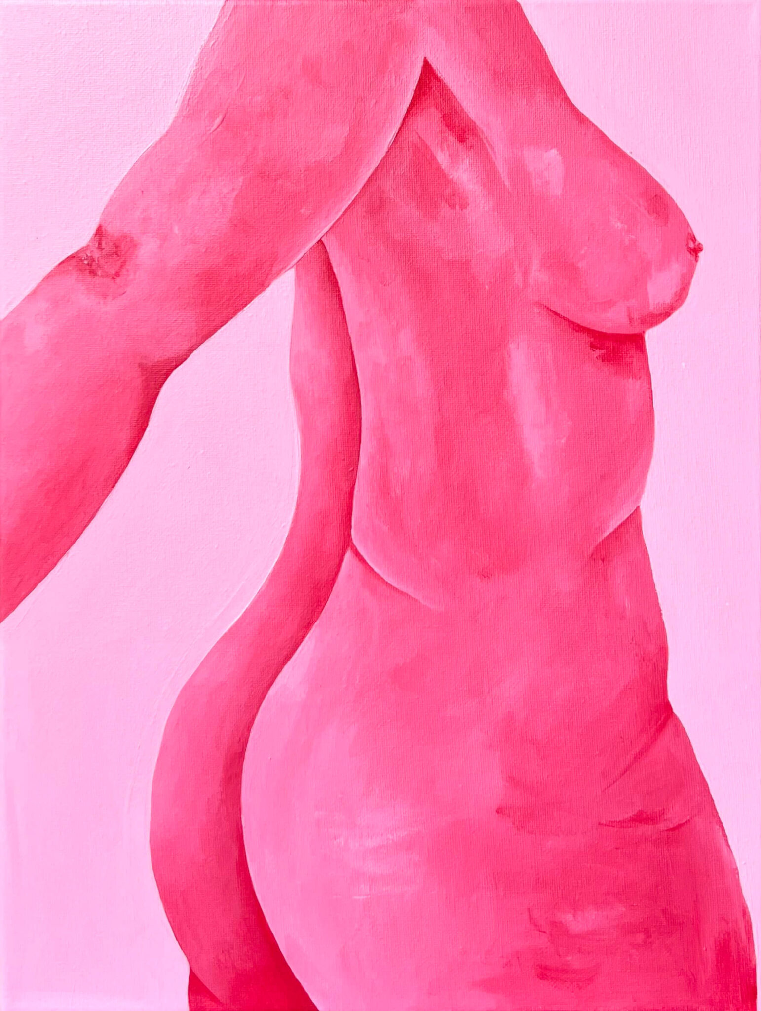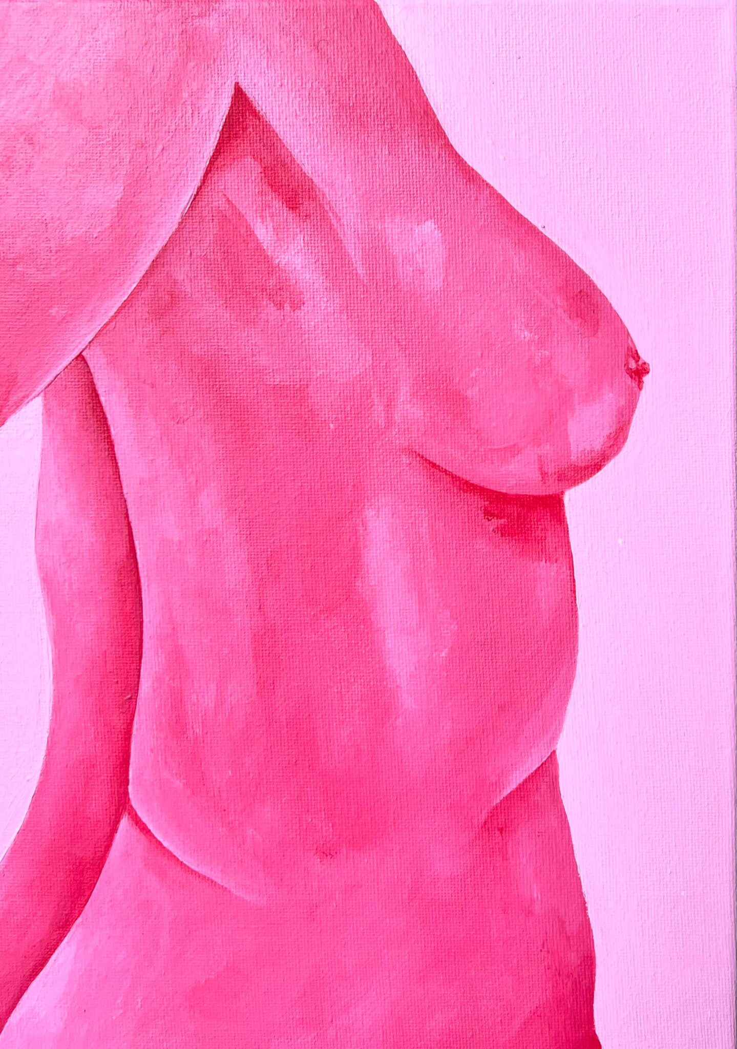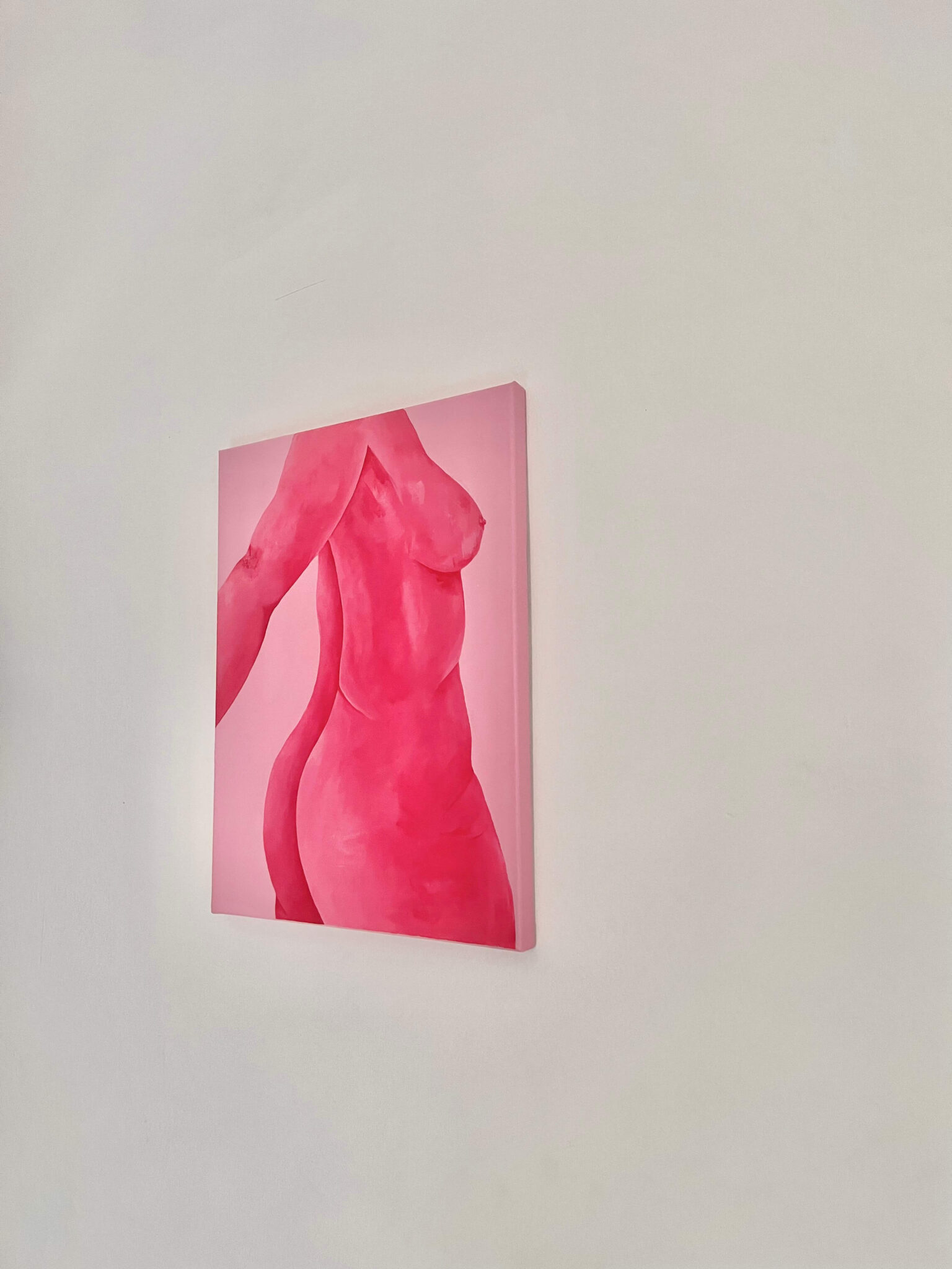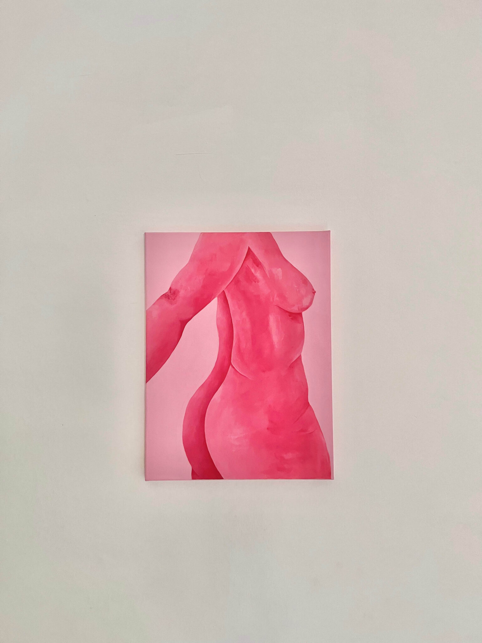 Acrylic painting in shades of pink. This work explores the female form through an abstract lens, focusing on realistic imperfections. Soft transitions between color fields create a sense of presence and weightlessness. A pared-down interpretation of the figurative, allowing the silhouette to speak without distraction.