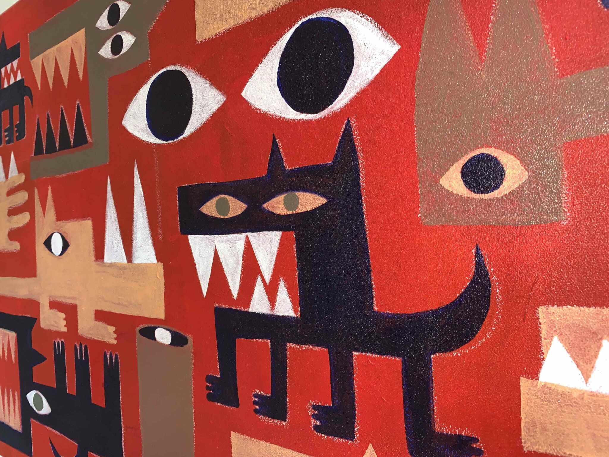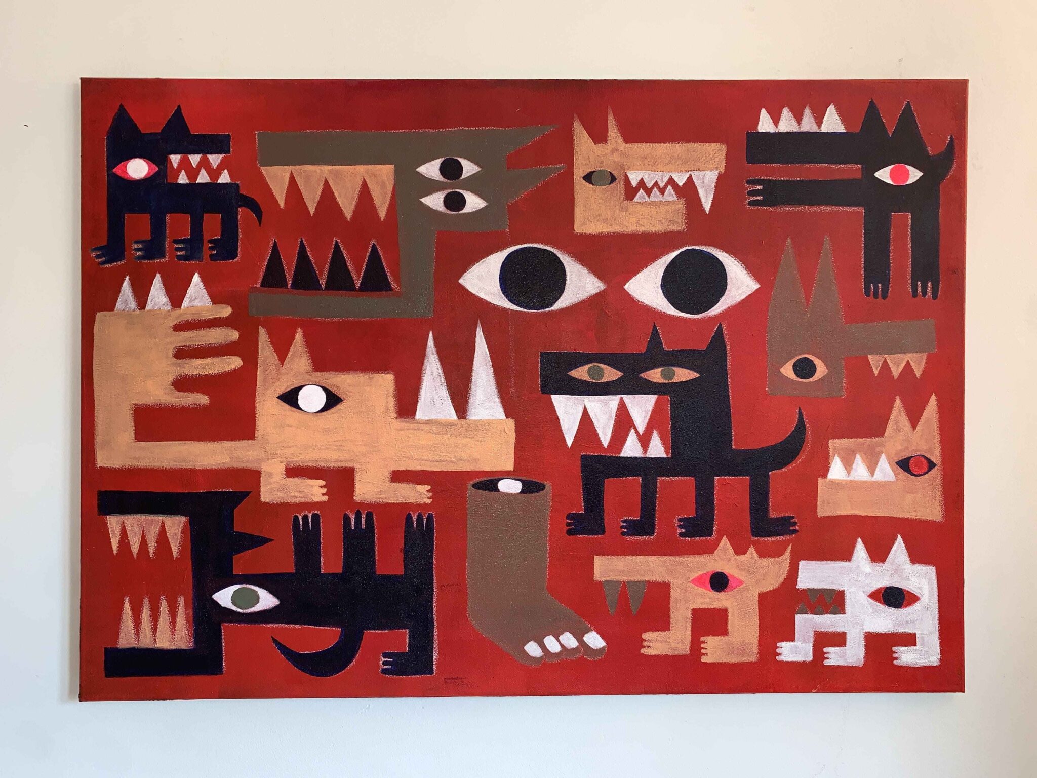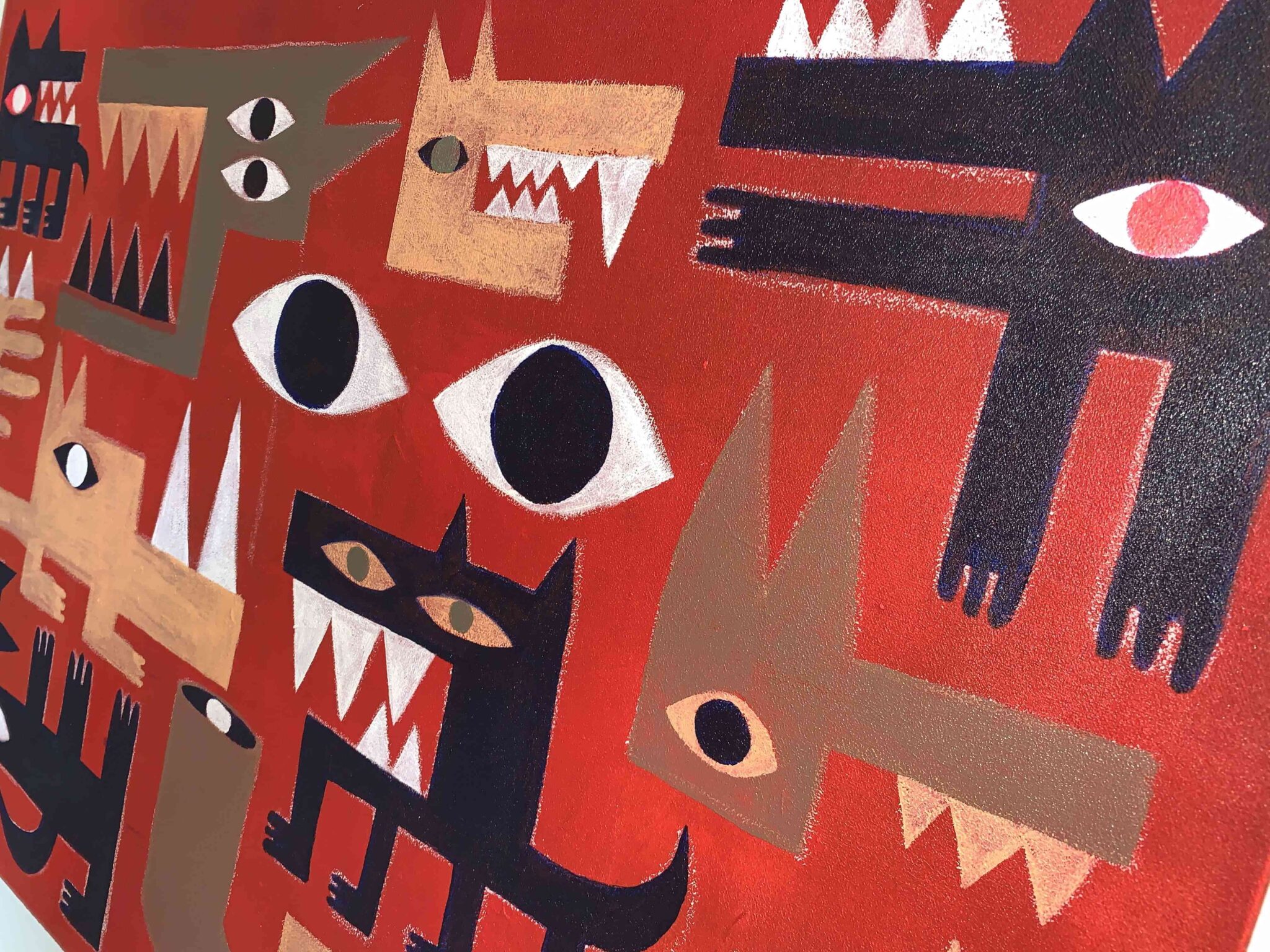 canidi, occhio e piede. elementi umani e animali si incastrano su uno sfondo astratto. nessuna prospettiva, assenza di tempo e spazio. esiste solo l'attimo presente. l'essere umano alla ricerca di sé, l'animale osserva le catastrofi che genera. assenza di morali ingombranti, non c'è giudizio. la ferocia dei denti viene limata da un disegno primitivo e infantile.