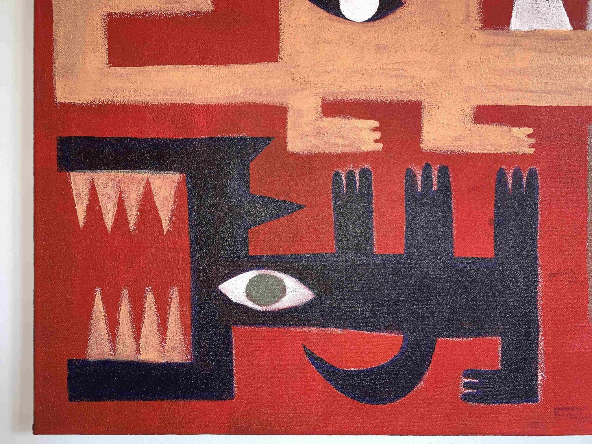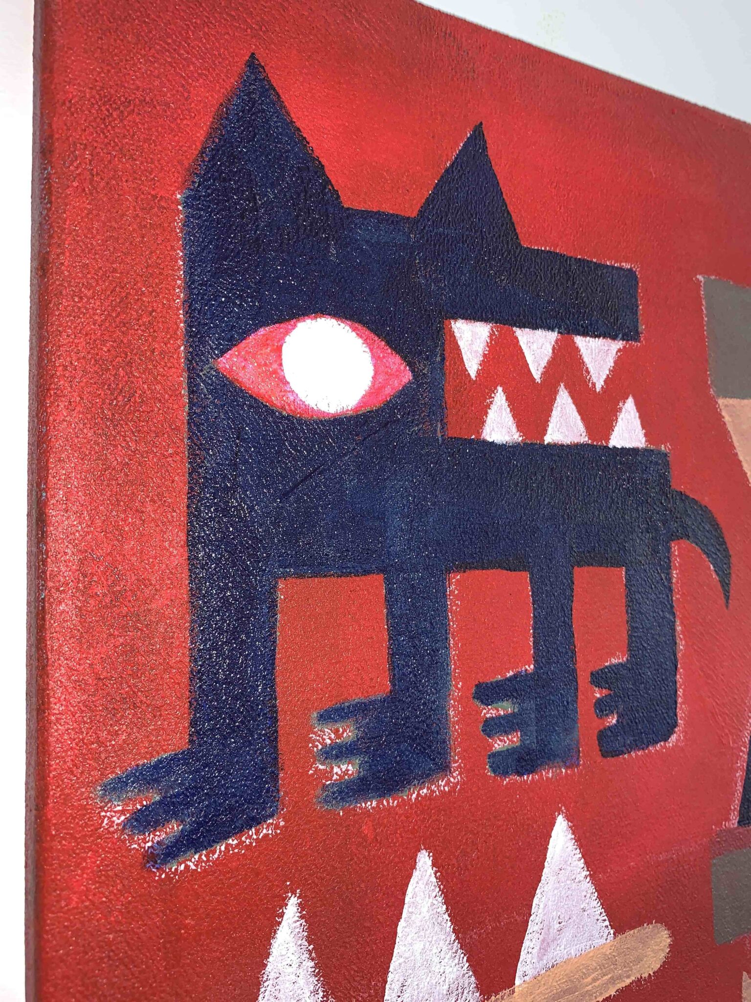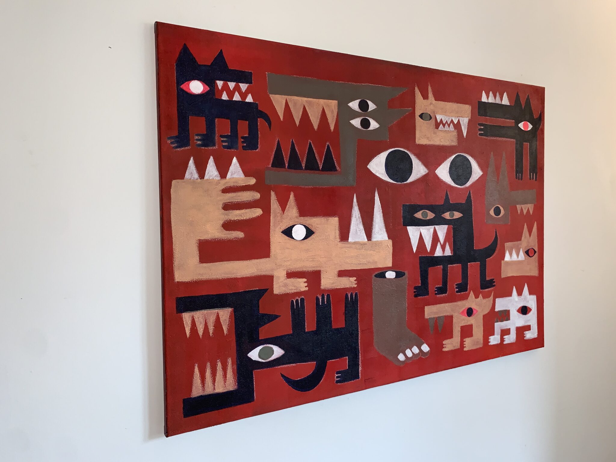 canidi, occhio e piede. elementi umani e animali si incastrano su uno sfondo astratto. nessuna prospettiva, assenza di tempo e spazio. esiste solo l'attimo presente. l'essere umano alla ricerca di sé, l'animale osserva le catastrofi che genera. assenza di morali ingombranti, non c'è giudizio. la ferocia dei denti viene limata da un disegno primitivo e infantile.