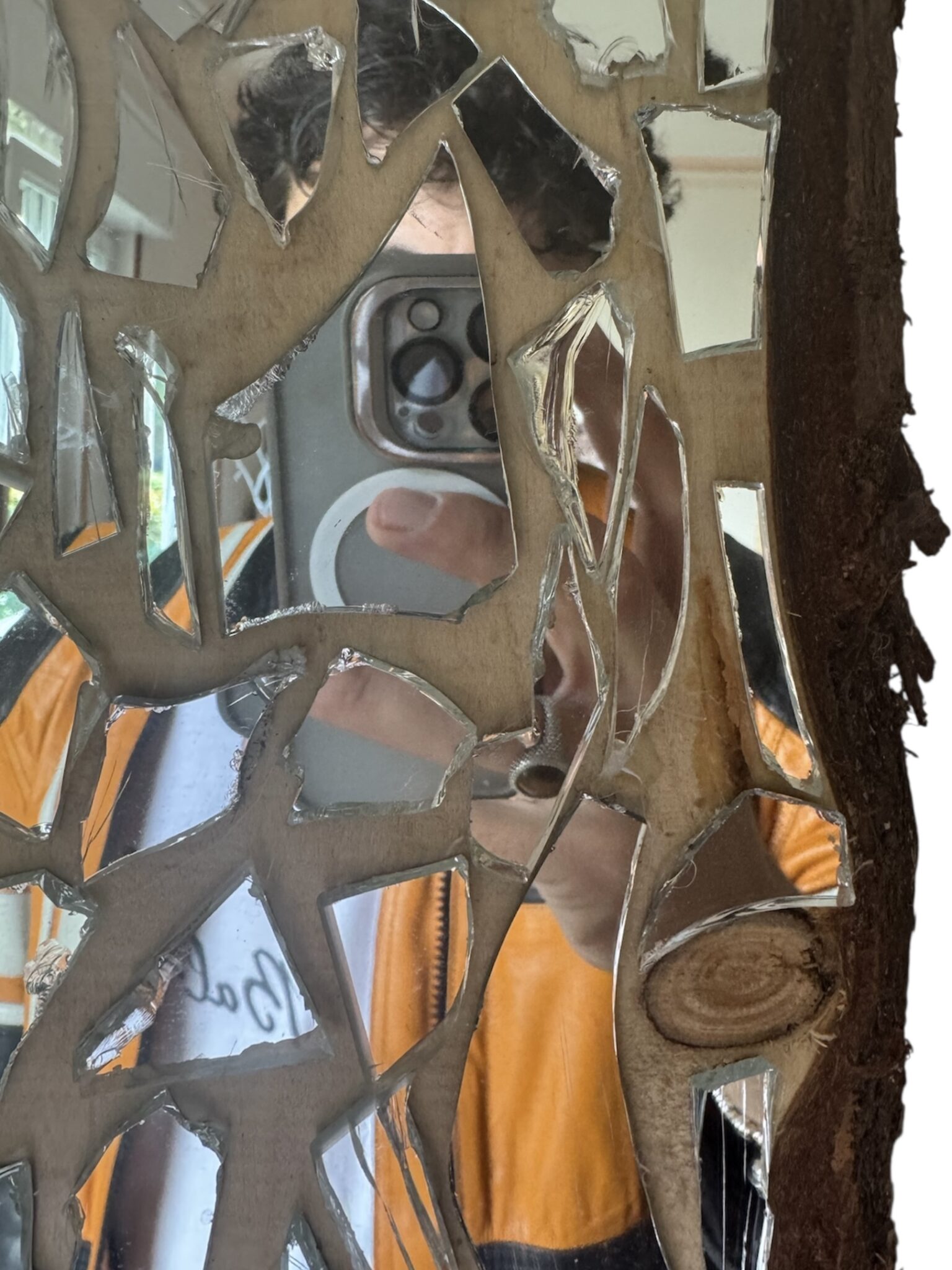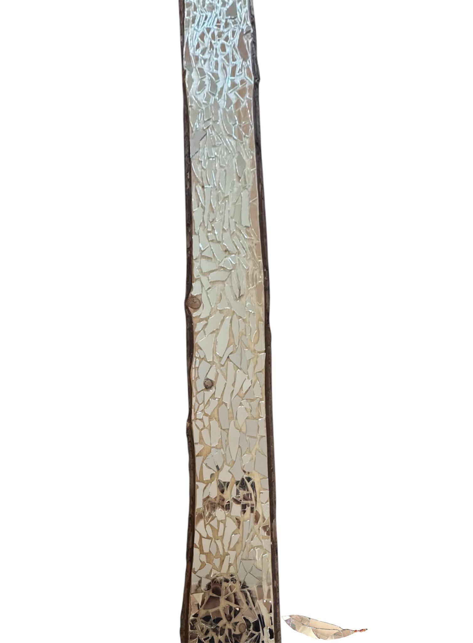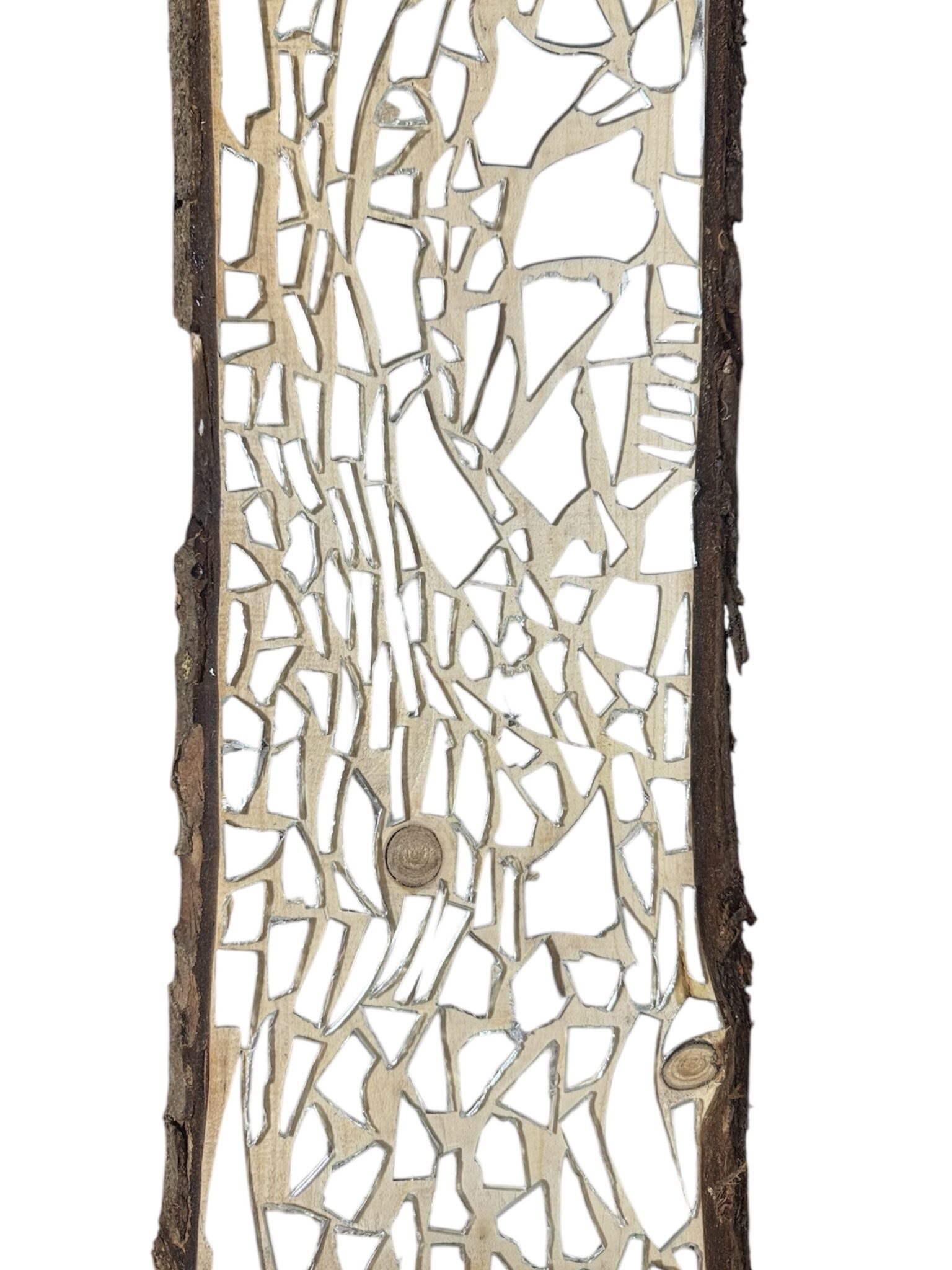 L’opera rappresenta il tronco reciso di un albero, la cui corteccia non è fatta di legno ma di frammenti di specchio disposti con cura a ricostruire le venature della pianta . Ogni scheggia cattura la luce e riflette il volto dello spettatore, costringendolo a confrontarsi con la perdita e la memoria. Il taglio netto del tronco è simbolo di un’interruzione, di un sapere reciso, mentre i frammenti alludono a ciò che resta — brandelli di saggezza, visioni sparse di un sapere antico ormai smarrito.