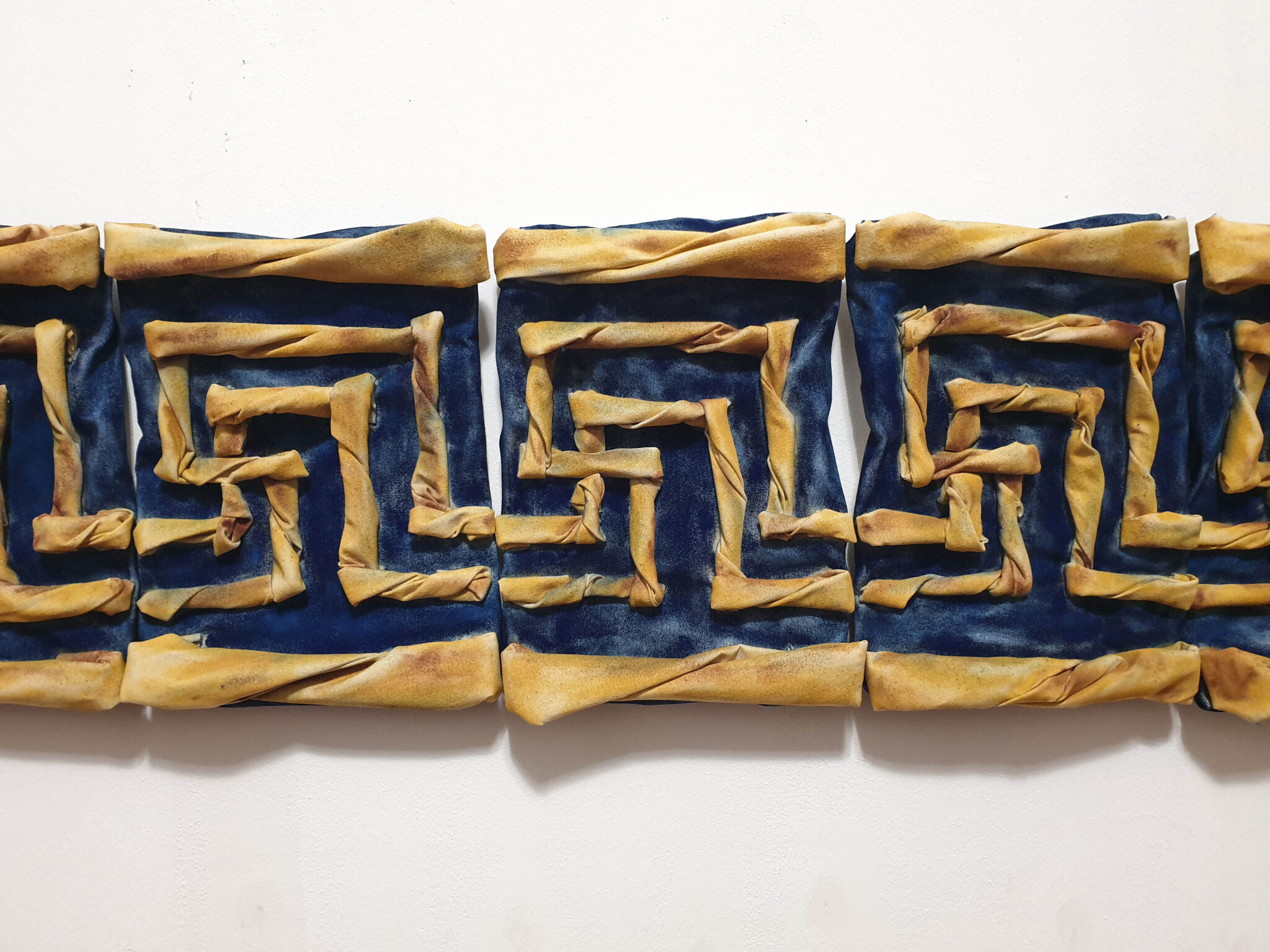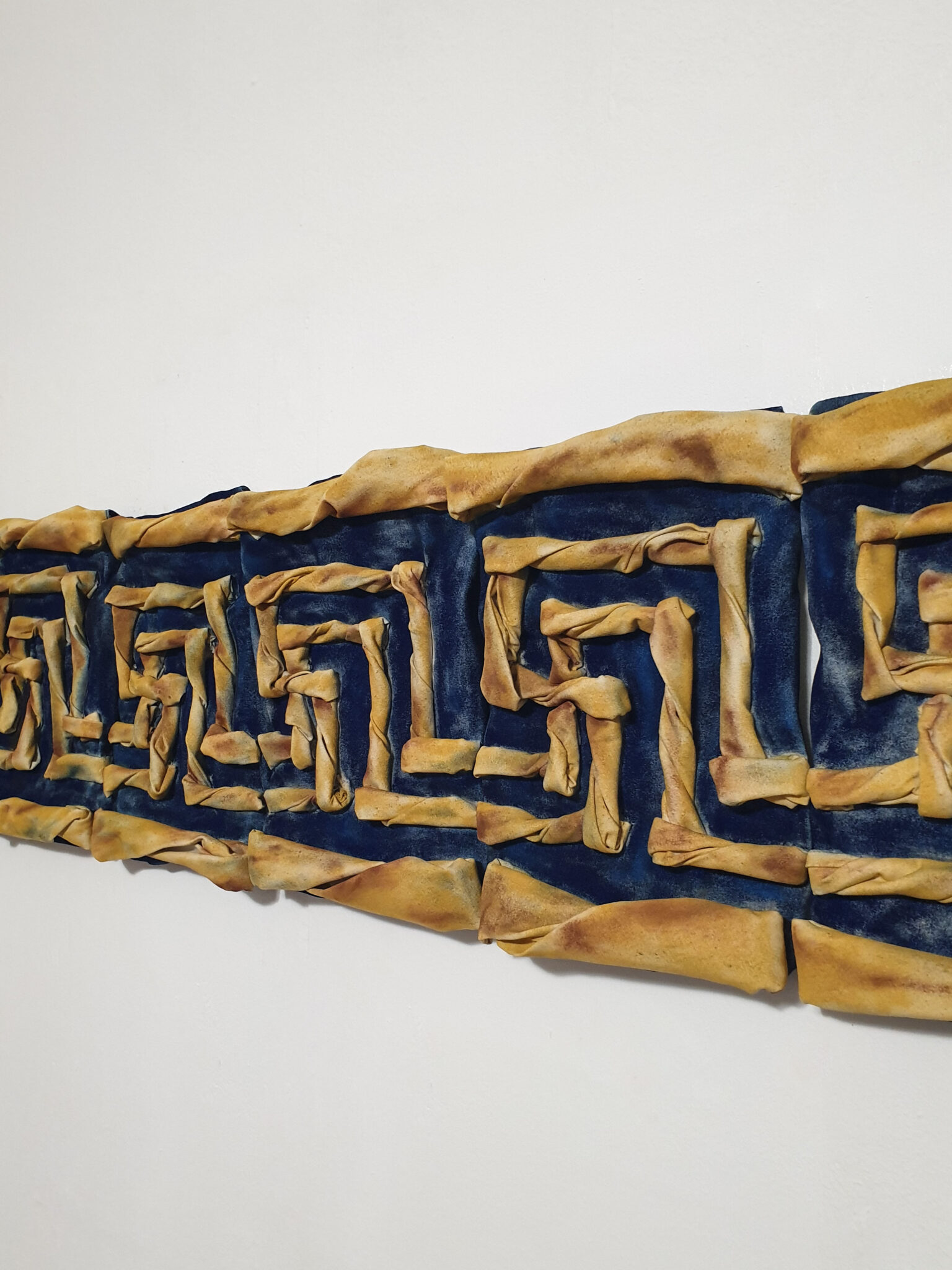 Fregio è un’installazione bidimensionale a parete costituita da 16 piastrelle in tela di dimensioni di 30 x 20 cm ciascuna, disposte su due fasce continue, una superiore e una inferiore.