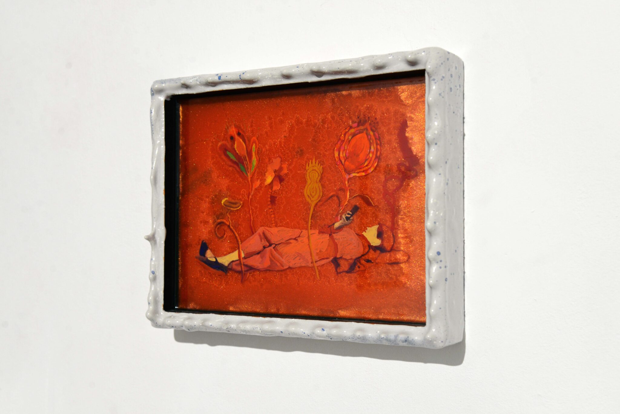 L’opera presenta una figura femminile distesa al centro della composizione, circondata da piante surreali. Il fondo, di un vibrante arancione, è realizzato con resina che crea una lucentezza e una superficie traslucida. Intorno alla figura si sviluppano elementi vegetali “alieni”, resi con acrilico che crea un contrasto materico tra la superficie liscia e brillante del fondo e la consistenza più opaca e corporea dei fiori e della figura stessa.