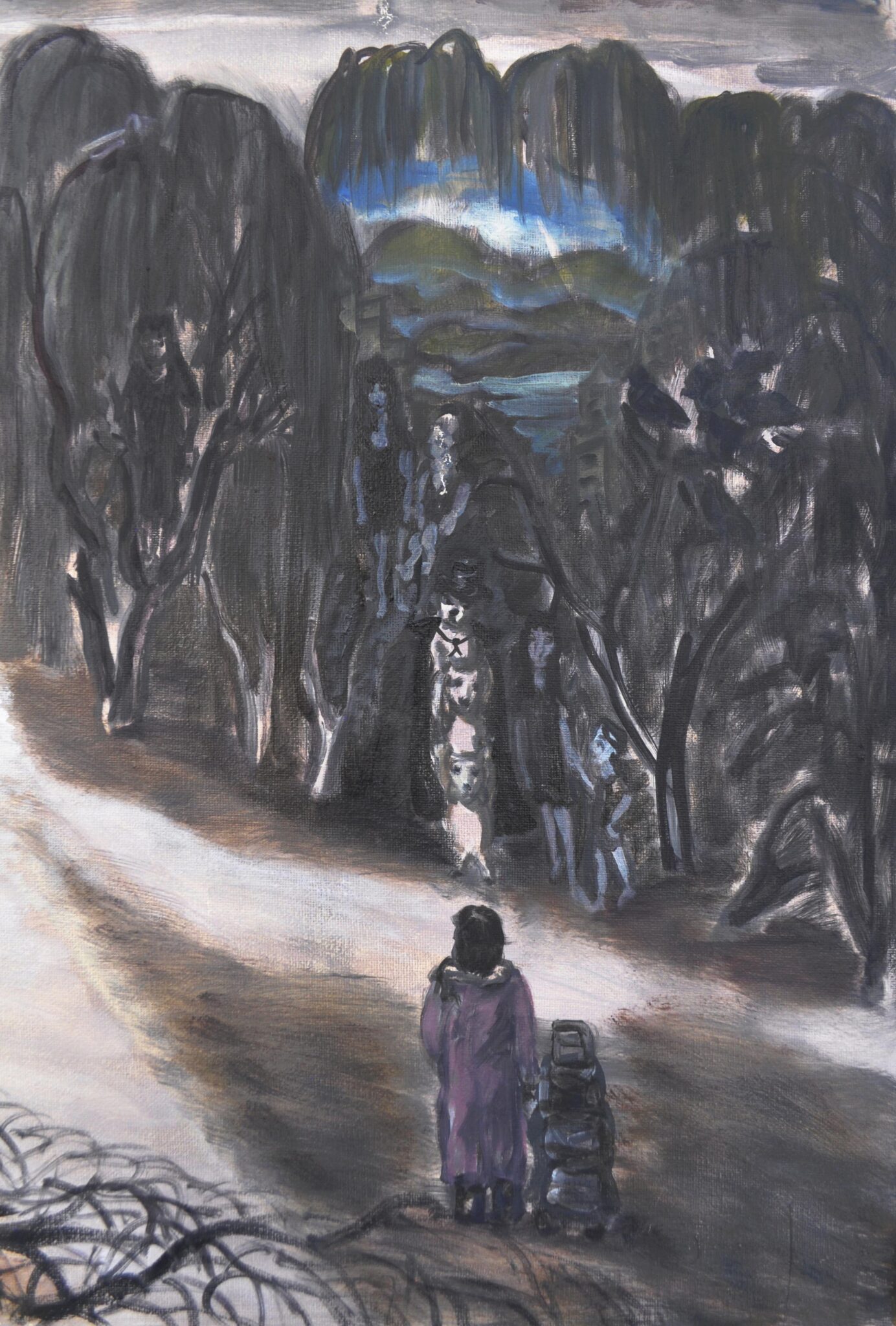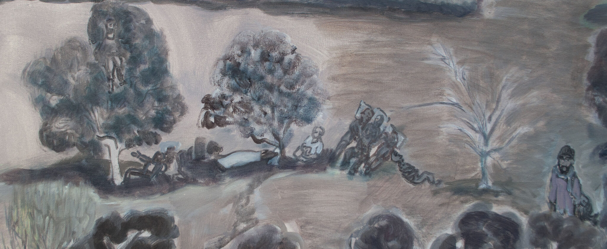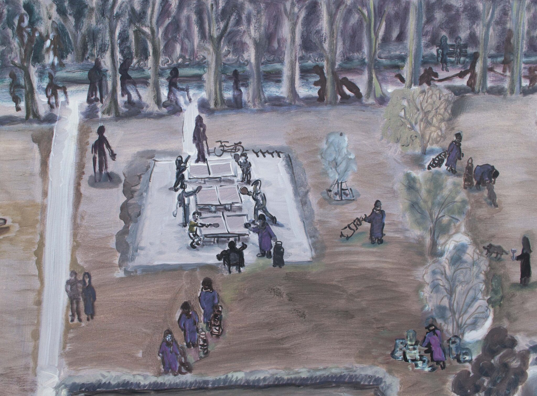 Quest’opera è una veduta aerea di un parco reimmaginato a partire dal parco Bissuola di Mestre. Sono partito dal tema della pigrizia. La storia che ho usato come pretesto narrativo vedeva come figura principale quella di un senzatetto che si aggirava per il parco imbattendosi in varie situazioni all’interno del parco, tra le quali una presenza diabolica che lo metteva in difficoltà (una strega e suoi seguaci). Influenzato da “Il Maestro e Margherita” di M. Bulgakov, ho cercato di riflettere, attraverso la pittura, sulle pulsioni vitali e l’attrito della realtà che ci frena, su questo contrasto che spesso porta ad una situazione di stallo che portano le persone a rimanere bloccati, adattandosi ad un contesto che non desiderano.