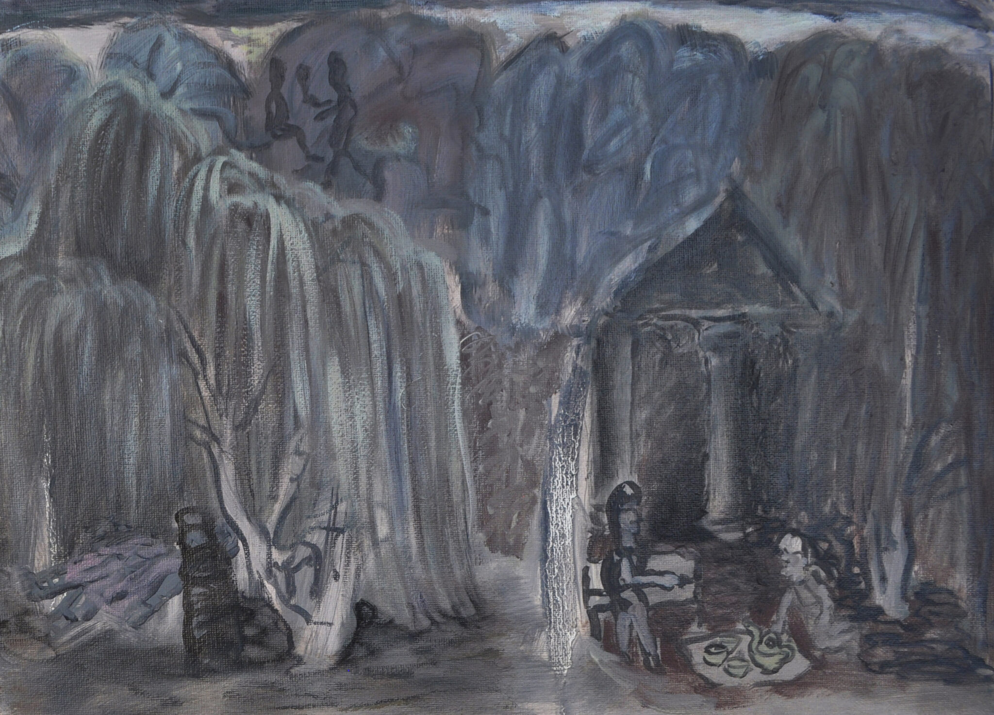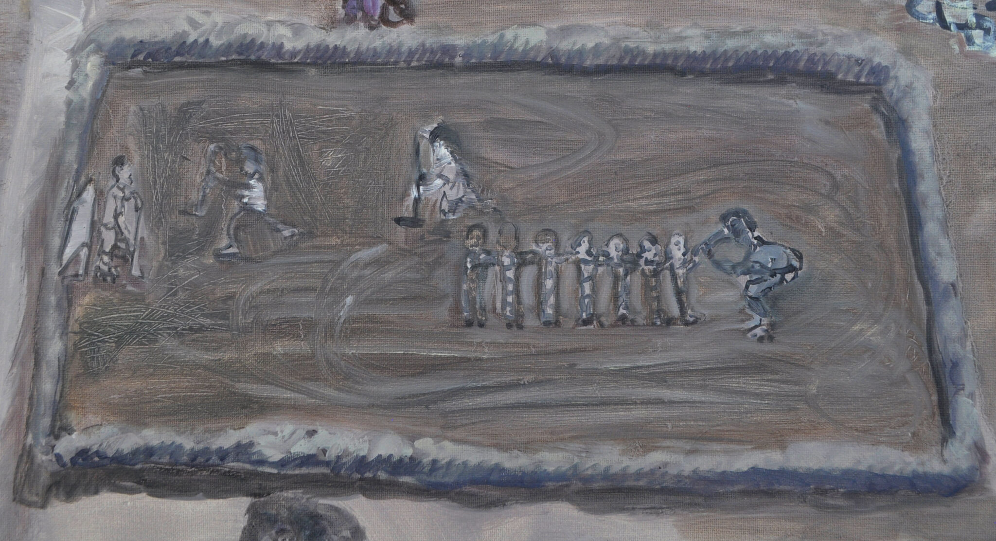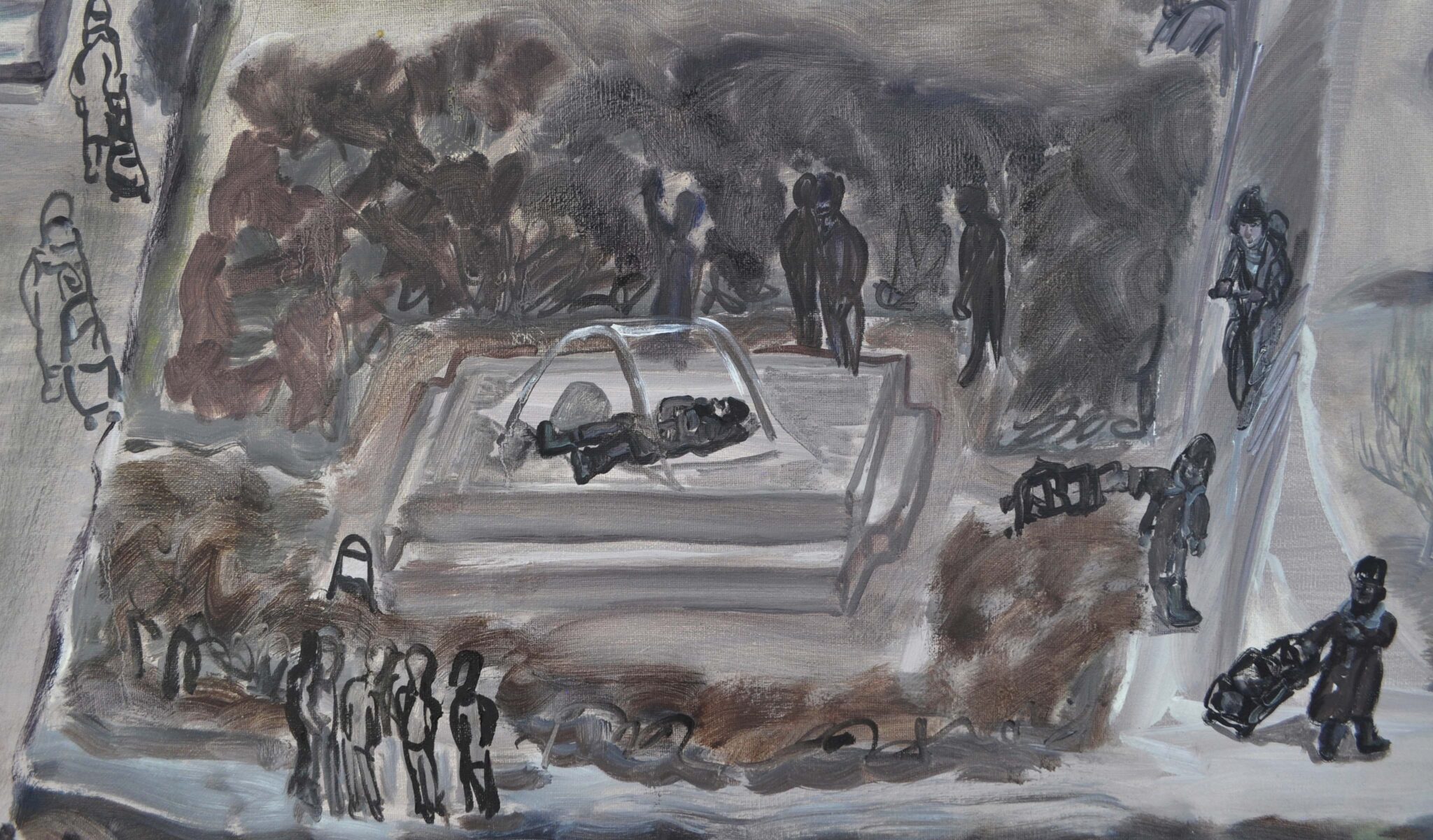 Quest’opera è una veduta aerea di un parco reimmaginato a partire dal parco Bissuola di Mestre. Sono partito dal tema della pigrizia. La storia che ho usato come pretesto narrativo vedeva come figura principale quella di un senzatetto che si aggirava per il parco imbattendosi in varie situazioni all’interno del parco, tra le quali una presenza diabolica che lo metteva in difficoltà (una strega e suoi seguaci). Influenzato da “Il Maestro e Margherita” di M. Bulgakov, ho cercato di riflettere, attraverso la pittura, sulle pulsioni vitali e l’attrito della realtà che ci frena, su questo contrasto che spesso porta ad una situazione di stallo che portano le persone a rimanere bloccati, adattandosi ad un contesto che non desiderano.