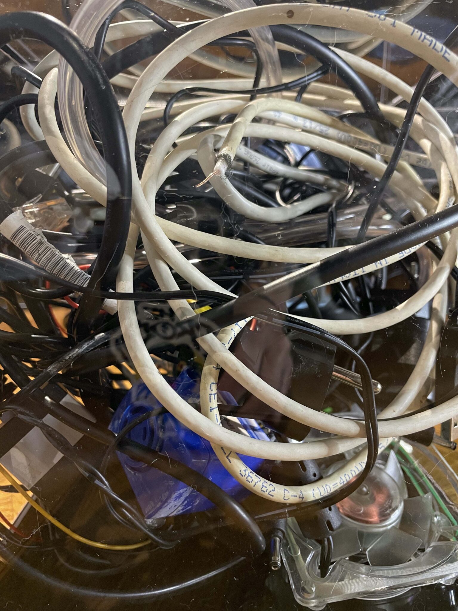 cavi, trasformatori, cablaggi, nanocam, monitor, plexiglass.