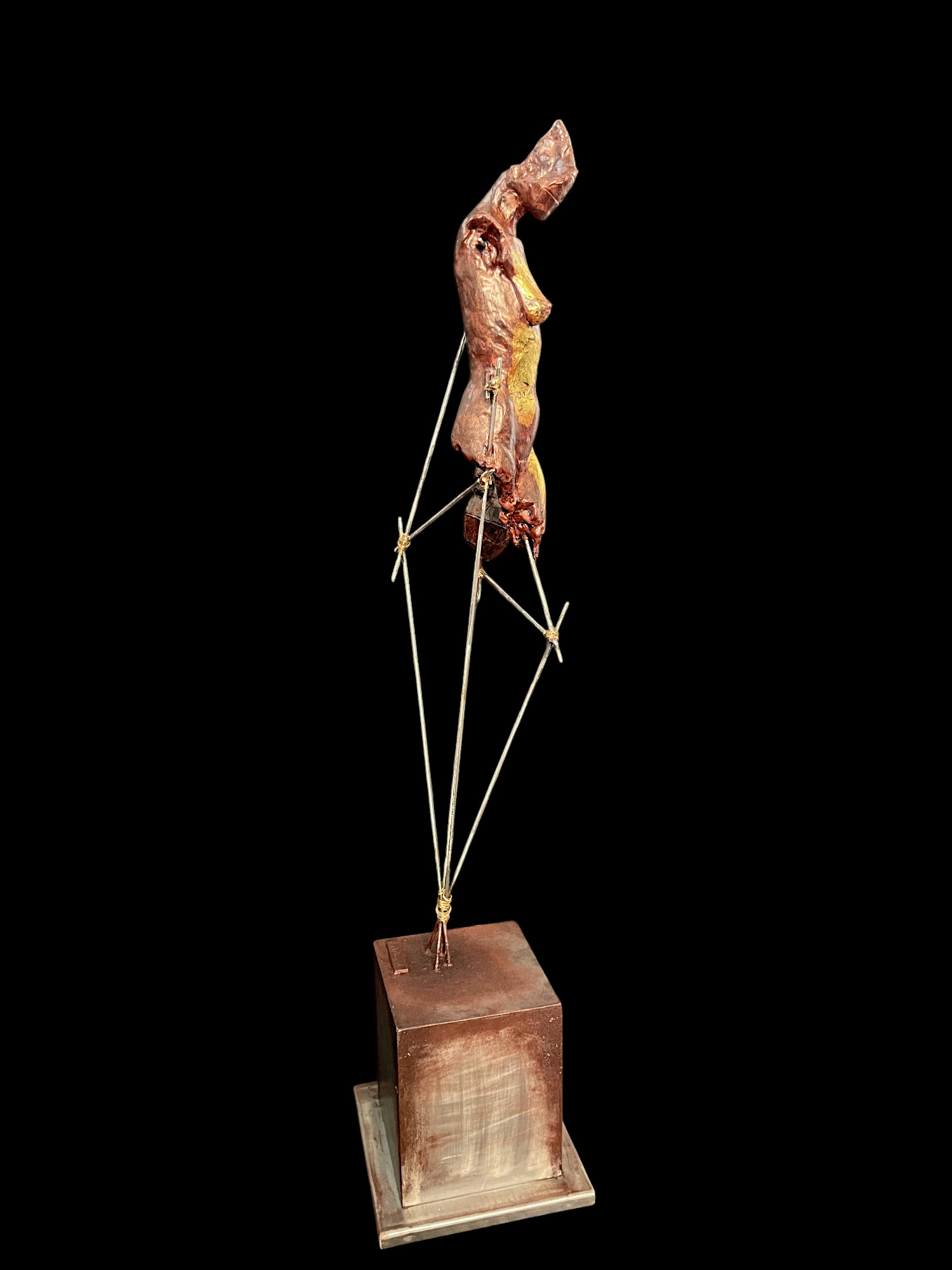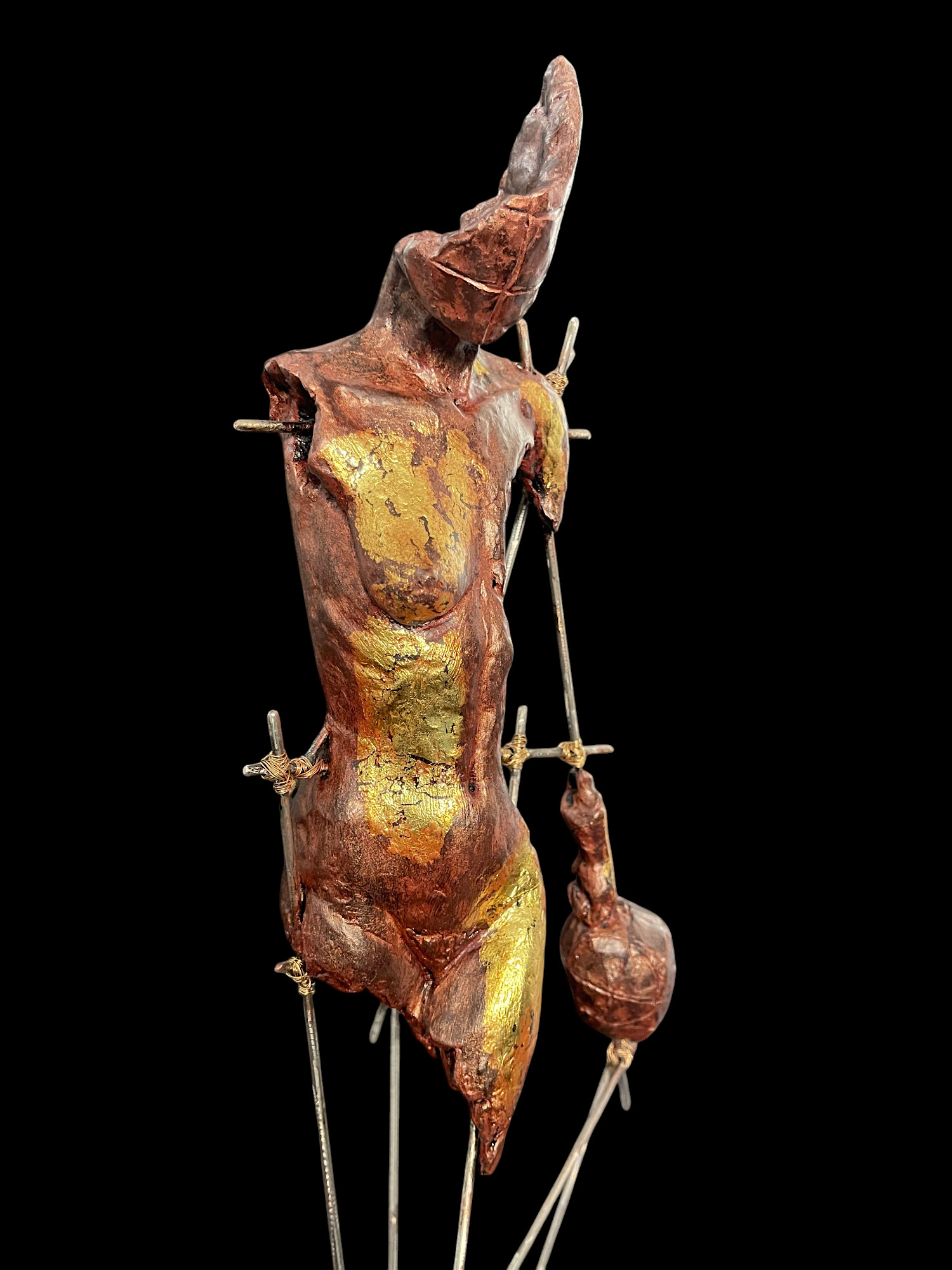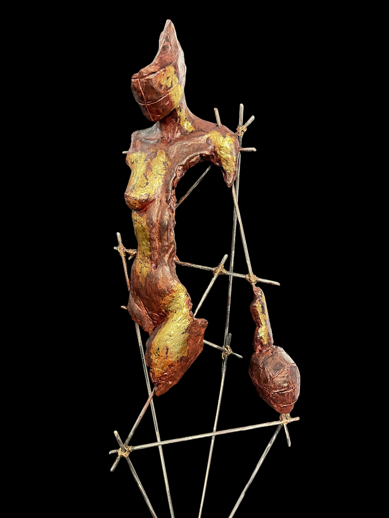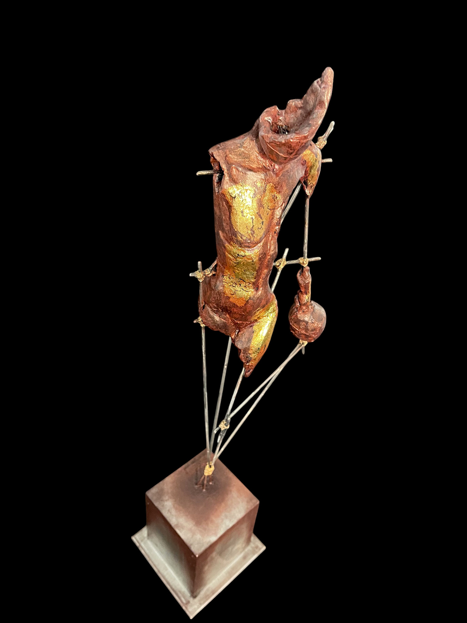 Acciaio inossidabile saldato, resina, legature in filo di bronzo, foglia oro