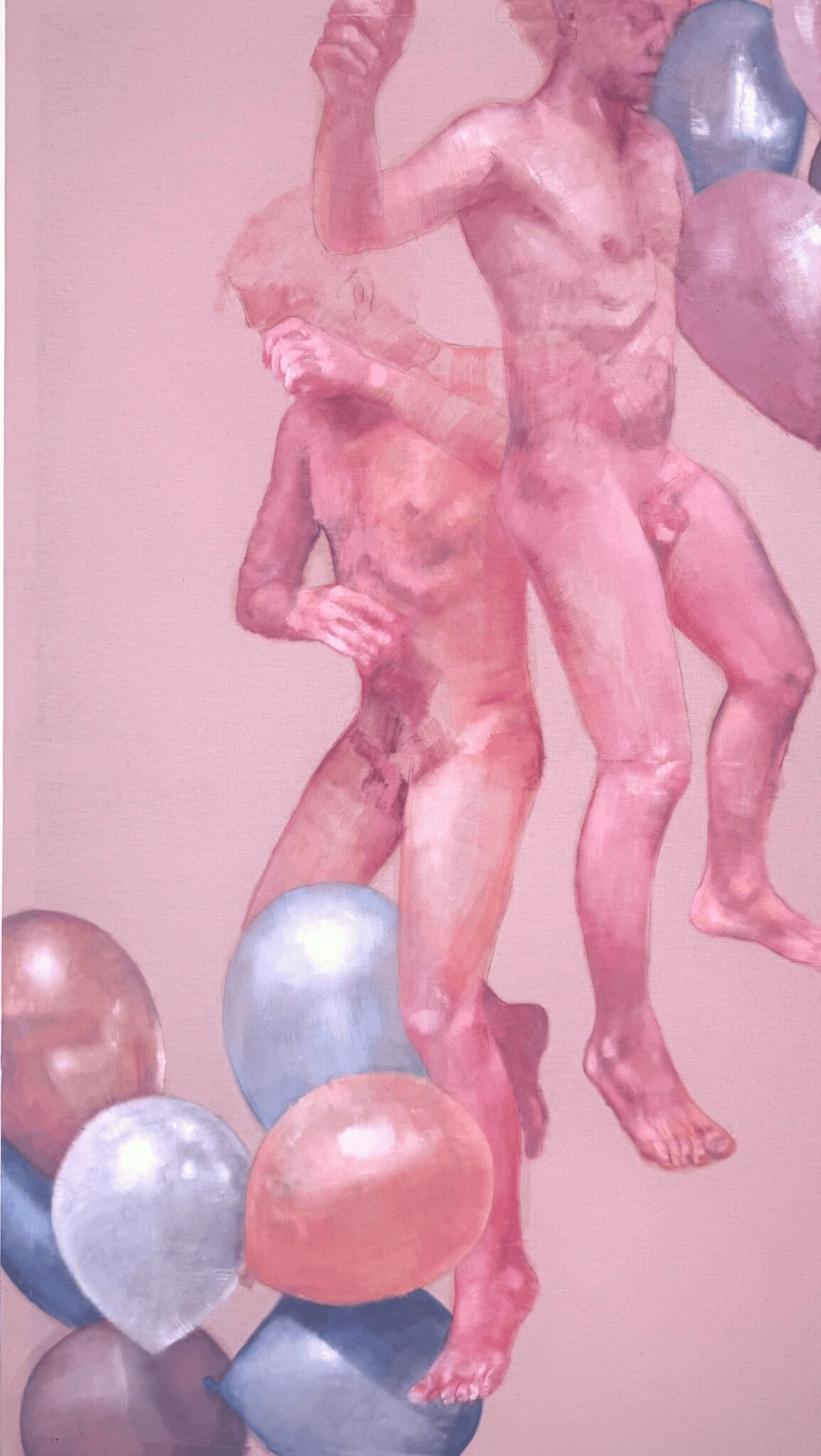 L’opera appartiene alla mia serie più recente, Nessun limite, nemmeno il cielo, un progetto in cui indago il desiderio profondo di trascendere i propri confini, fisici e simbolici, per tendere verso una dimensione di elevazione. Il corpo sospeso, derivato da autoritratti, si fa emblema visivo di tale tensione interiore: figure che si spingono fino ai margini della superficie pittorica, come se lo spazio della tela non potesse più contenerne l’impulso ascensionale, né arrestarne il moto. La tela grezza che le ospita non è un semplice supporto, ma uno spazio sospeso, un luogo altro. È il palcoscenico su cui la scena si rivela come un fermo immagine, un frammento strappato al flusso continuo dell’esistenza. La sua interruzione svela la fragile struttura latente della realtà. L’azzurro che la attraversa amplifica questa sospensione, evocando un cielo mentale, un altrove indefinito dove i confini si fanno incerti e, anche solo per un istante, le cose smettono di cadere.