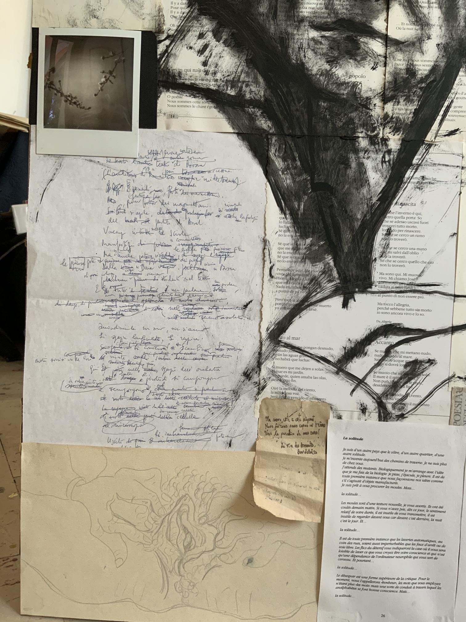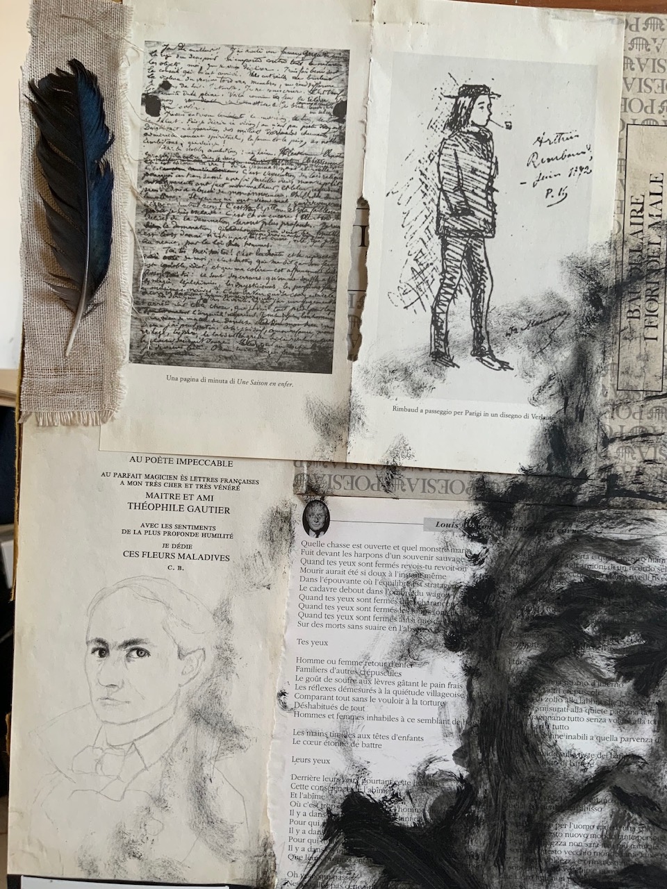 Olio, inchiostro, graffite, polaroid, carta, piuma e colla su tavola