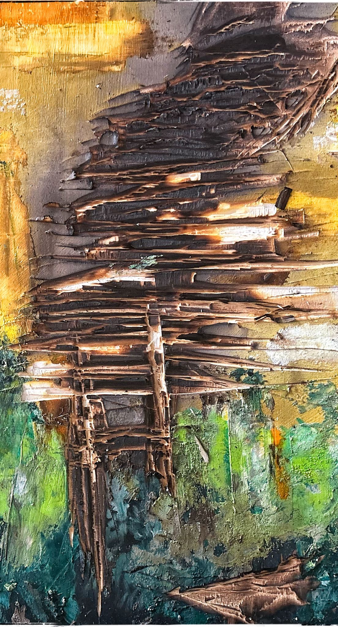 I toni gialli caldi che predominano nel dipinto evocano sensazioni di calore e vitalità, ma al contempo possono suggerire un'idea di pericolo e instabilità. La vegetazione in basso, che potrebbe sembrare un elemento di tranquillità, diventa parte di un contesto più ampio di conflitto e tensione. La spatola, utilizzata per lavorare ulteriormente la superficie, introduce una dimensione tattile e materica, rendendo l'opera non solo visiva ma anche fisica, invitando lo spettatore a esplorare le sue texture.