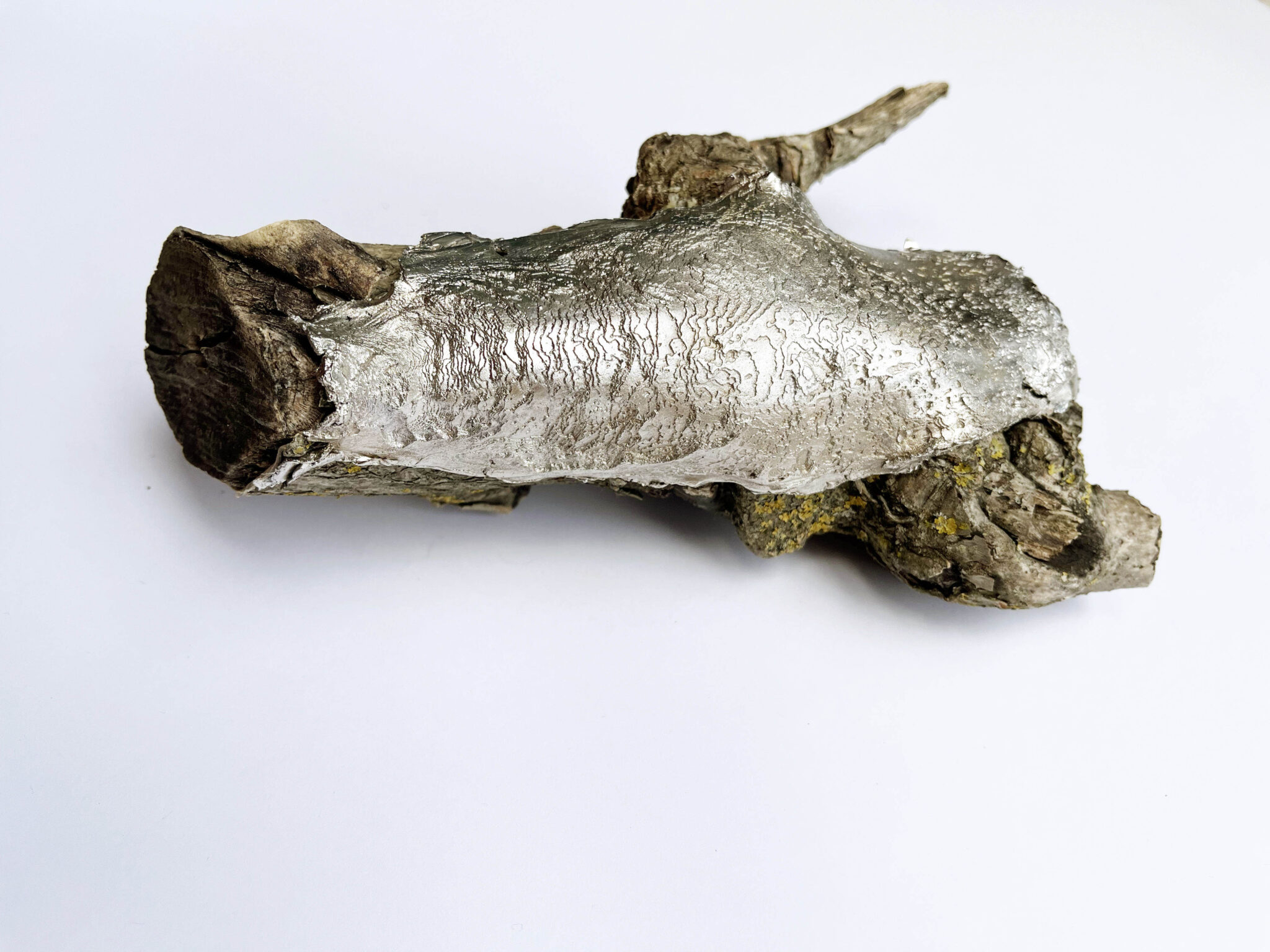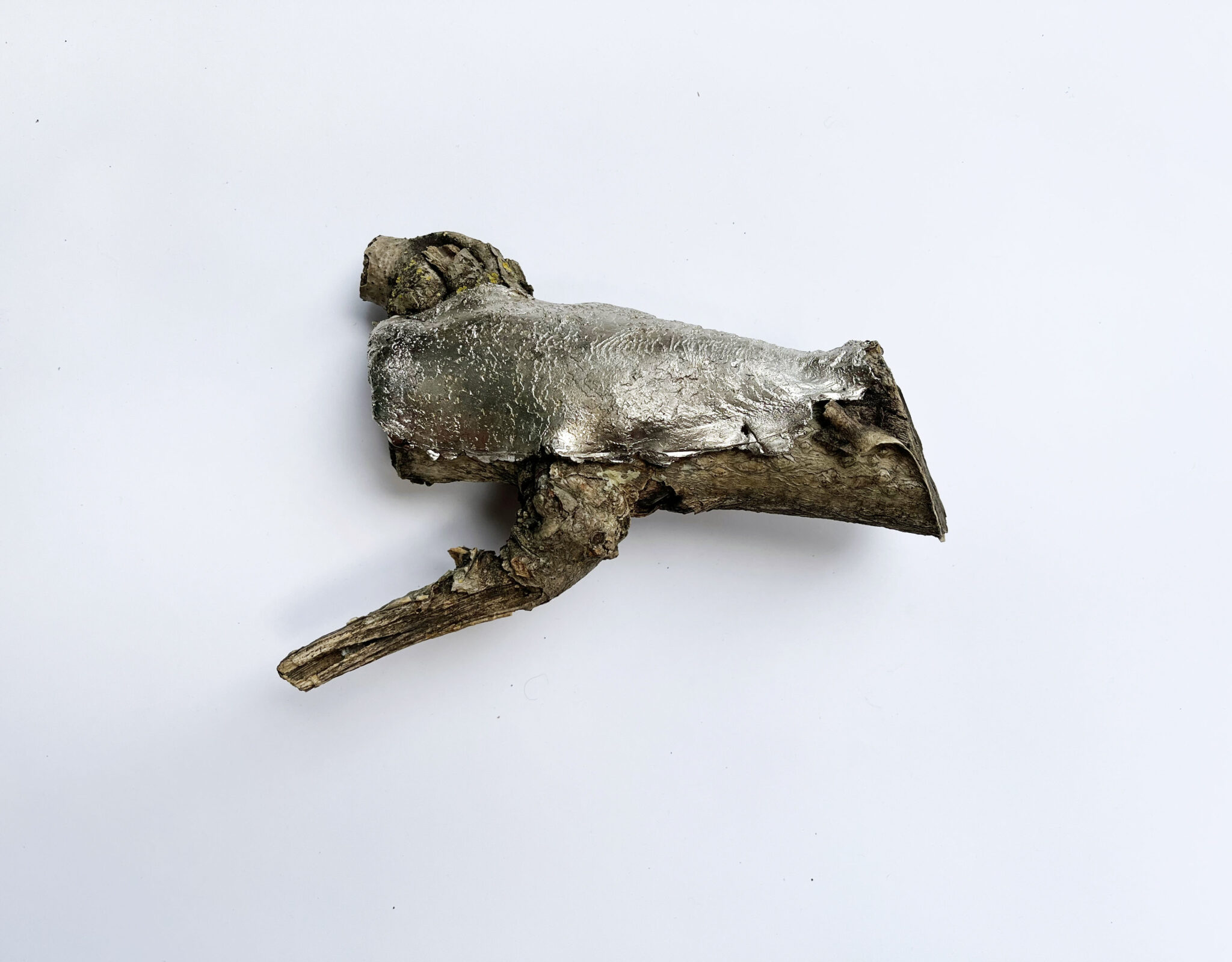 Un ramo recuperato in un bosco è ricoperto parzialmente da una seconda pelle realizzata per fusione. Nel metallo è inscritta la provenienza della matrice, un osso in seppia recuperato su una spiaggia.