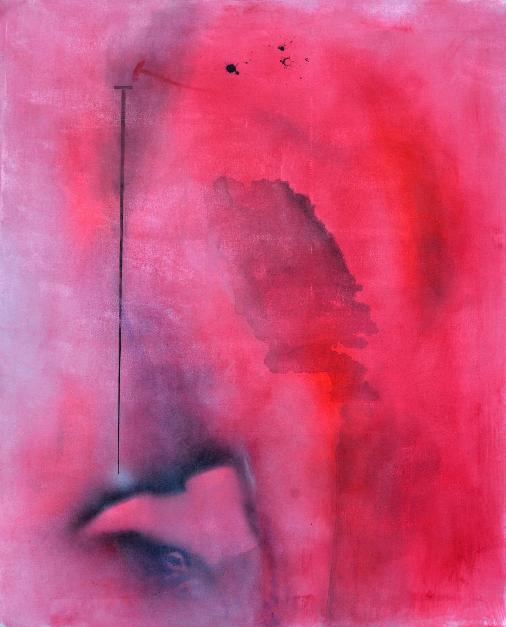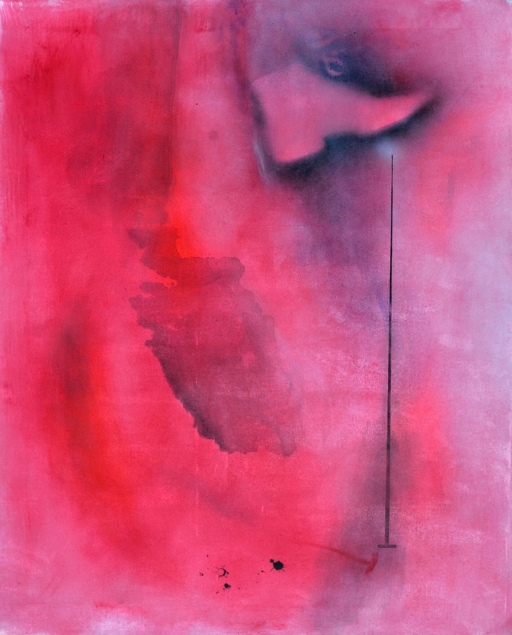L’oggetto scarpa, indumento reale indossato nel momento in cui il chiodo si infilza nel mio piede, viene impresso sulla tela con la bomboletta spray. La sagoma che ne deriva stabilisce un punto di incontro tra la realtà e il pensiero astratto.