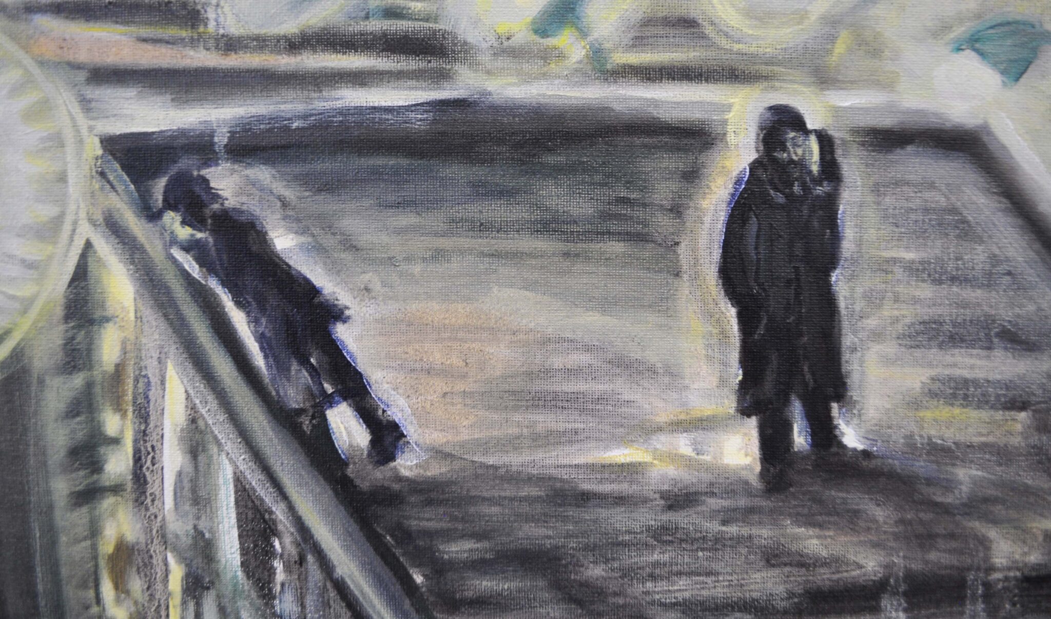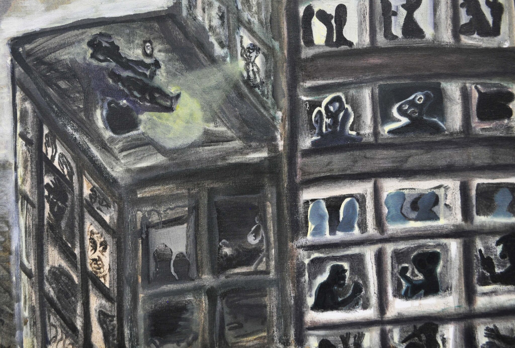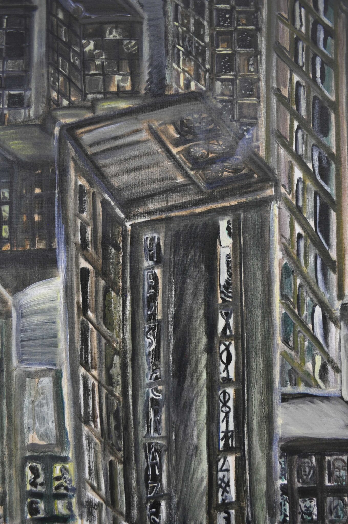 Quest'opera l'ho realizzata durante la mia permanenza a Hangzhou (Cina) ed è incentrata sul tema della pigrizia. Si sviluppa come una veduta ispirata alle periferie delle metropoli cinesi. Inizialmente ho pensato a costruire una sorta di romanzo criminale fatto di percorsi e indizi all'interno del quadro. Successivamente si è creata una riflessione sul fare pittorico da un punto di vista cinematografico: le finestre dei palazzi si srotolano come una pellicola e ci lasciano vedere frame di vita casalinga fatta di ansie e pulsioni, quasi a voler uscire da una specie di prigionia e fare la rivoluzione.