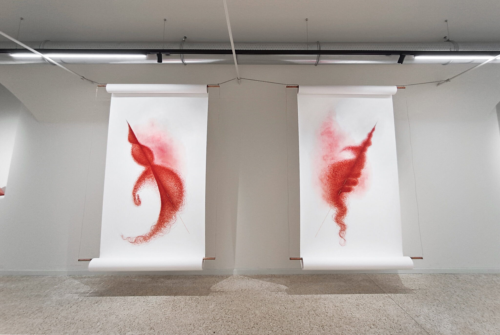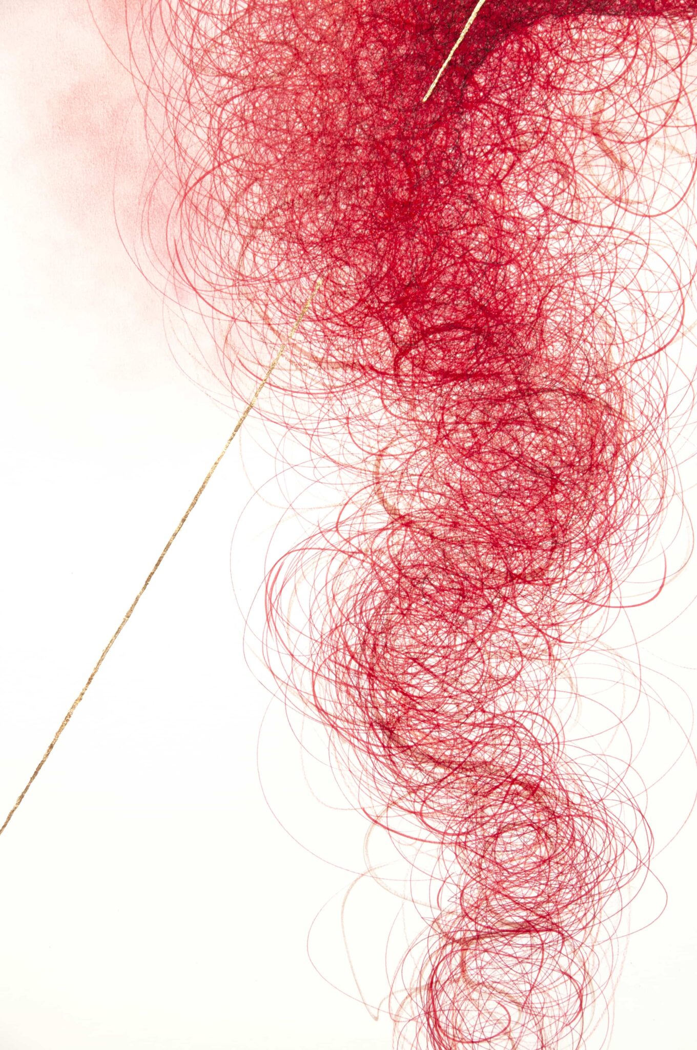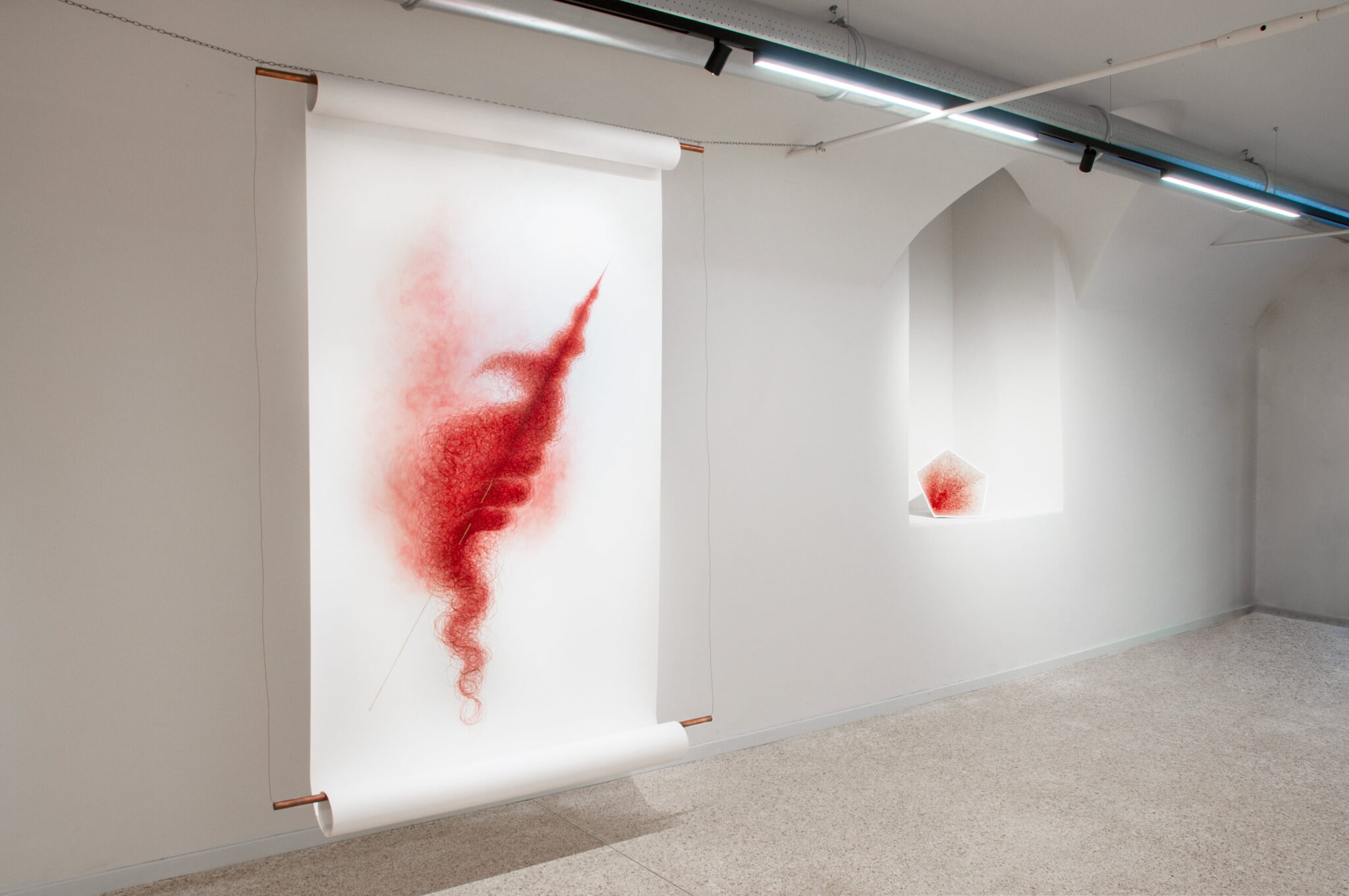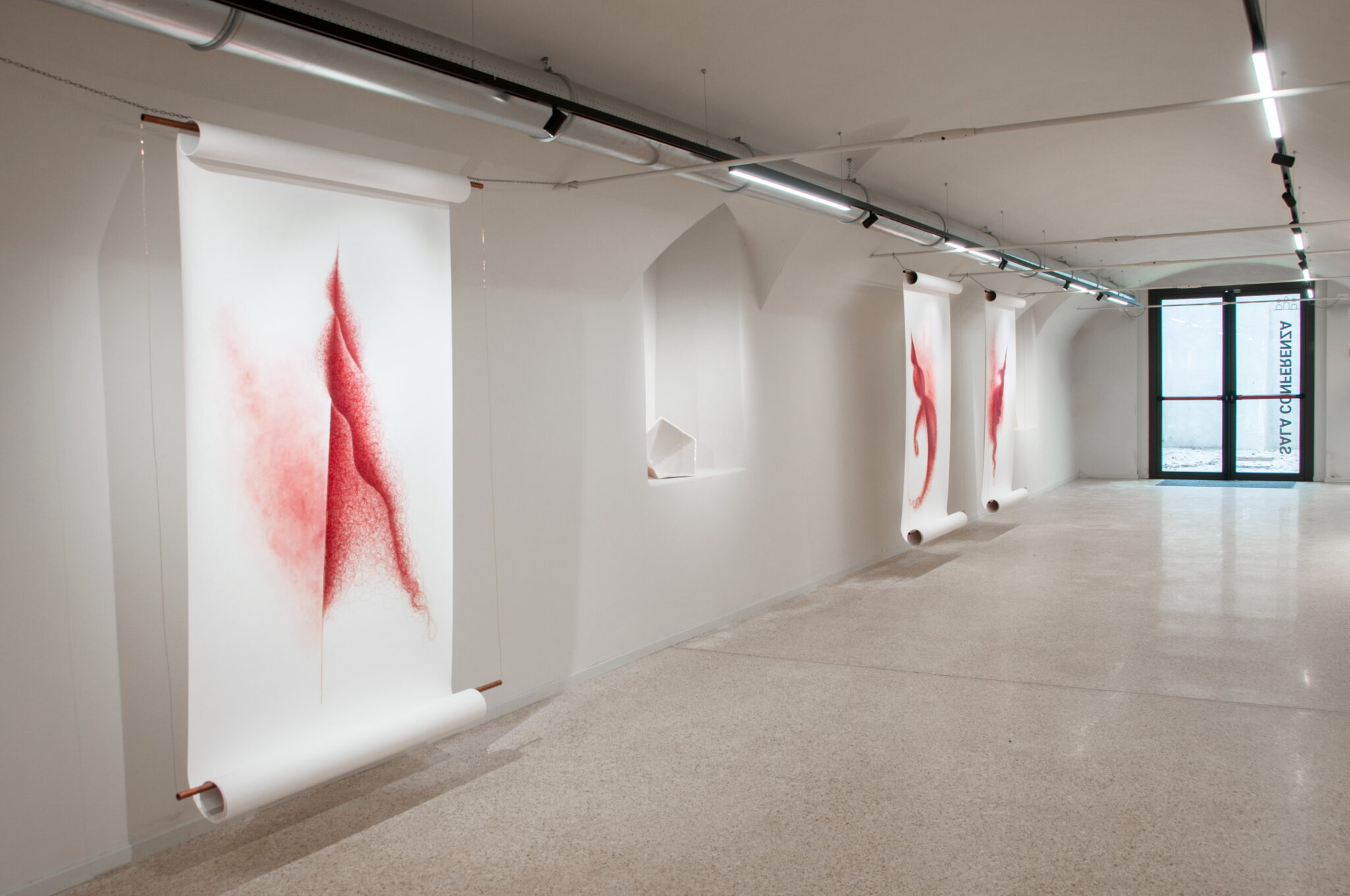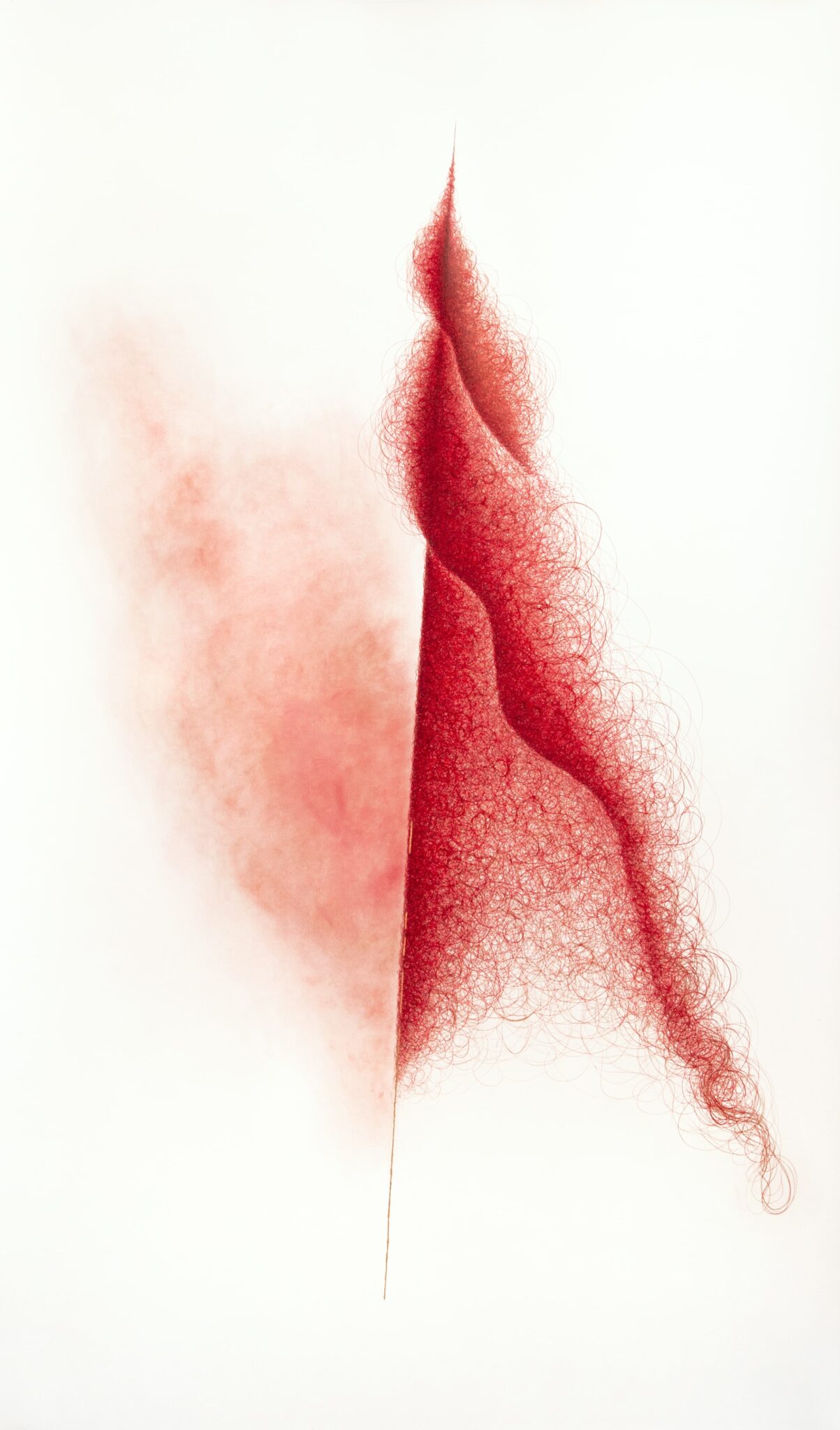 La serie delle Red Flags attualmente comprende 3 pezzi. Il titolo rende manifesta l’essenza del disegno: queste masse in movimento sono bandiere in balìa del vento che si avviluppano attorno all’asta. Non si tratta di bandiere politiche, ideologiche o geopolitiche ma semplicemente di pure manifestazioni di appartenenza. Il colore rosso è perciò determinante nell’esprimere una pura volontà energetica, infatti, grazie alla sua simbologia legata al sangue, al fuoco e al potere, è il colore deputato alla visualizzazione dell’Energia. Queste bandiere fumanti sono la massima sintesi della realtà fondata sull’Energia che si trasforma e mai si estingue nel Vuoto.