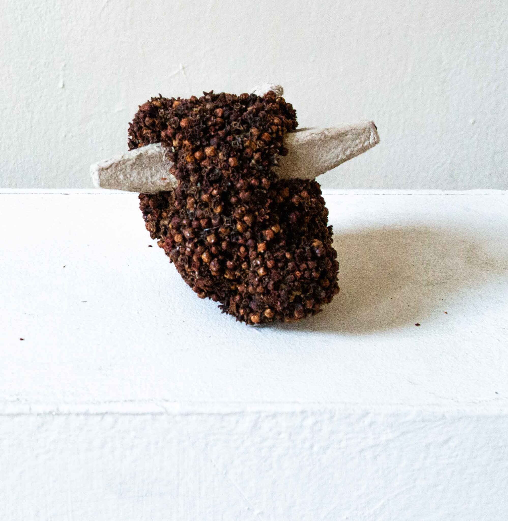 Synesthetic Beings is a series of sculptures in which I combine cloves with remnants of my everyday life—objects such as a showerhead, an egg carton, a cream tube, and a disposable hair dye comb. These materials, often dismissed as waste, already carry the traces of my past. On one hand, the work engages viewers through a powerful sensory register: smell. The cloves emit a scent directly connected to the limbic system, the part of the brain that governs emotion and memory. On the other hand, the installation invokes the Kurdish ritual of Sêva Mêxekrêj—a traditional practice in which an apple is covered entirely in cloves and offered to loved ones as a symbol of love, gratitude, or reconciliation. It is said that its smell lingers for a hundred years.