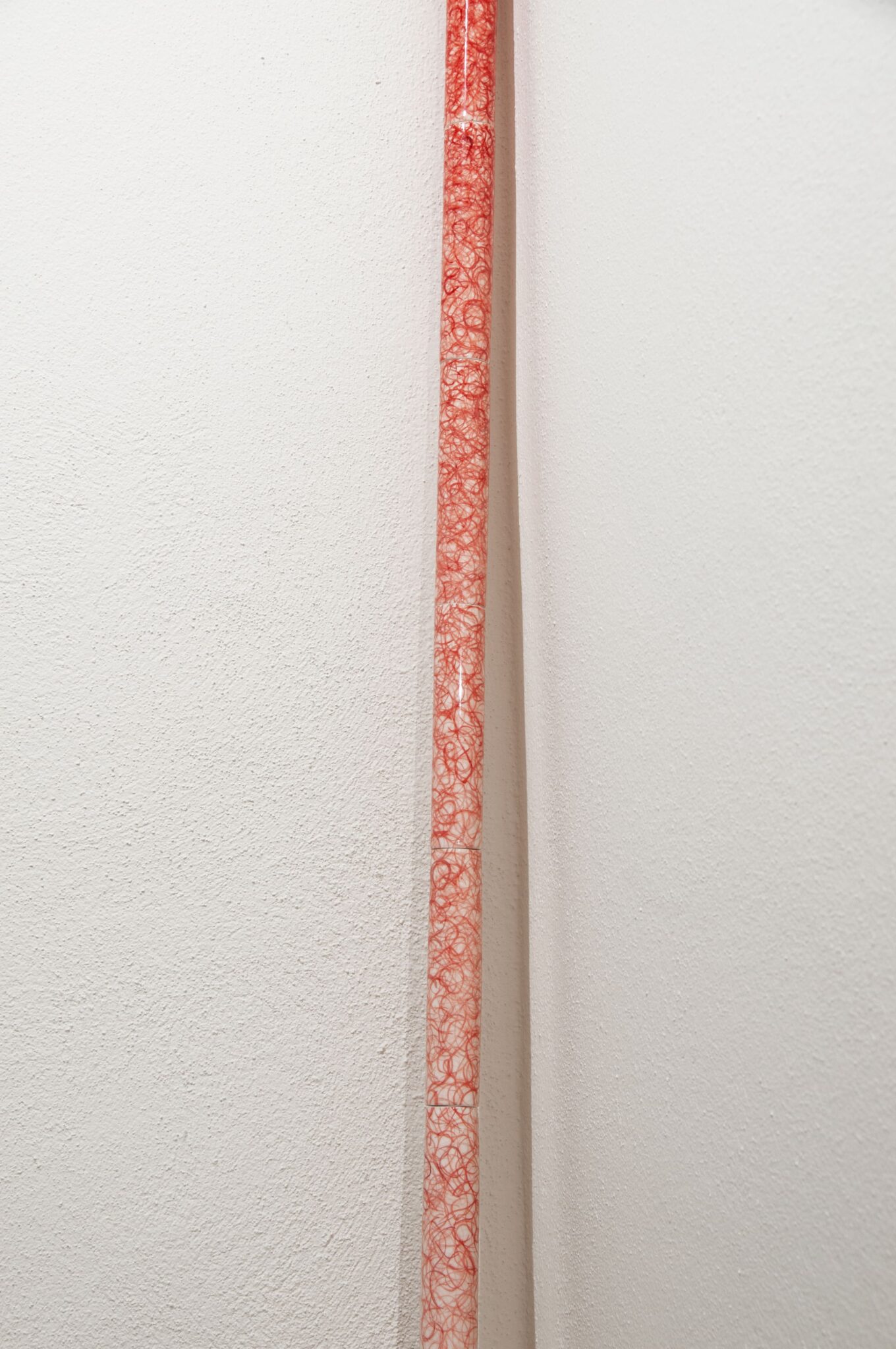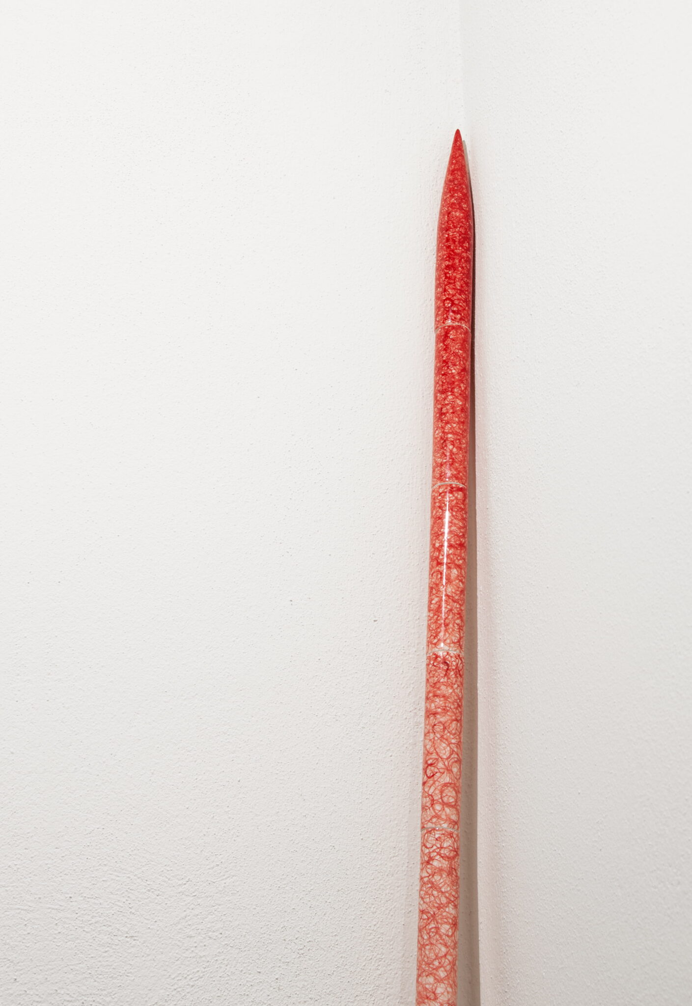 La transverberazione è la trafittura del cuore da parte di una manifestazione soprasensibile, come un angelo, ma anche da parte di una scarica di energia, un lampo divino, un'illuminazione intellettuale. Il dardo, puntatore o lancia (comunque lo si voglia chiamare) in ceramica bianca, è percorso da questa scarica energetica rossa che scaturisce dall'alto della punta e va a dissiparsi verso il basso.
