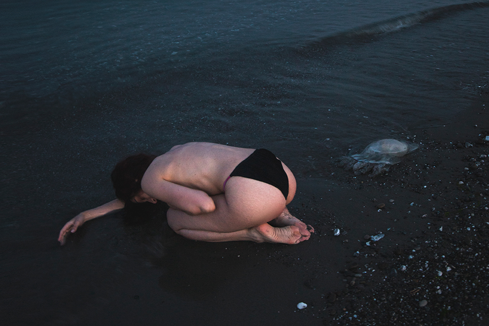 "Under the weather" è un viaggio costuito da visioni immaginarie. Untitled #1 afferisce ad una dimensione di realtà, come se fosse una cartolina dal passato, che sancisce l’inizio delle divagazioni, un’immersione nel metafisico o una caduta nel sogno. Le fotografie che seguono, invece, sono messe in scena del mentale, di visioni immaginate e poi rese visibili. Si gioca sull’ambiguità della narrazione: lo spetatore è invitato a chiedersi cosa sia successo prima e dopo ogni momento sospeso. Delle connessioni tra le fotografie sono alluse tramite elemen ricorren, generando la sensazione che ci sia un filo rosso lungo tuto il lavoro. Lo sguardo però non trova risposte poiché ogni immagine fa capo ad una storia a sé, ma nessuna di esse ha uno svolgimento. Luoghi si alternano ad autoscatti e tute le immagini sono ambientate durante il crepuscolo, l’ora blu, la quale suscita un’atmosfera onirica e misteriosa, di sospensione. Il titolo è un’ espressione idiomatica inglese di origine marinaresca che viene utilizzato oggi per indicare l’inizio di un malessere. Qui indica “l’ammalarsi” nel lasciarsi troppo andare in speculazioni mentali ma crea anche un gioco di parole con l’”under the water” di Untitled #1.